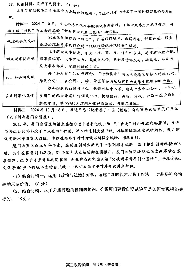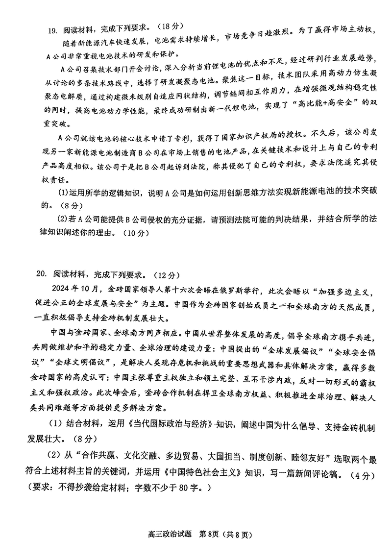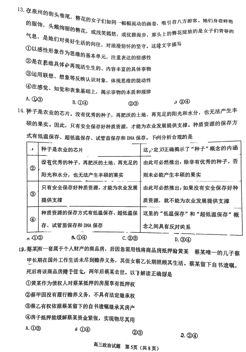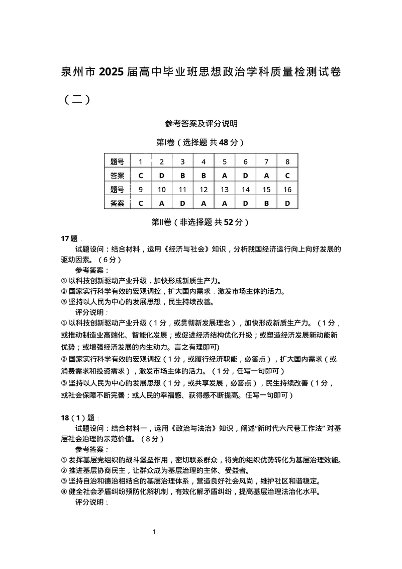 福建泉州2025届高中毕业班质量监测(二)政治试题及答案