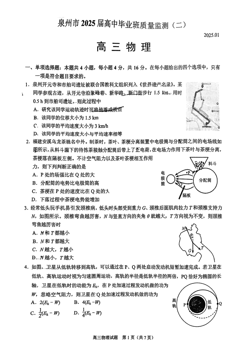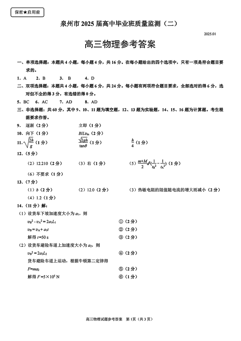 福建泉州2025届高中毕业班质量监测(二)物理考试已于近日开考,为方便考生考后及时查看考试情况,查漏补缺、弥补不足,本文整理了试题答案解析相关信息!