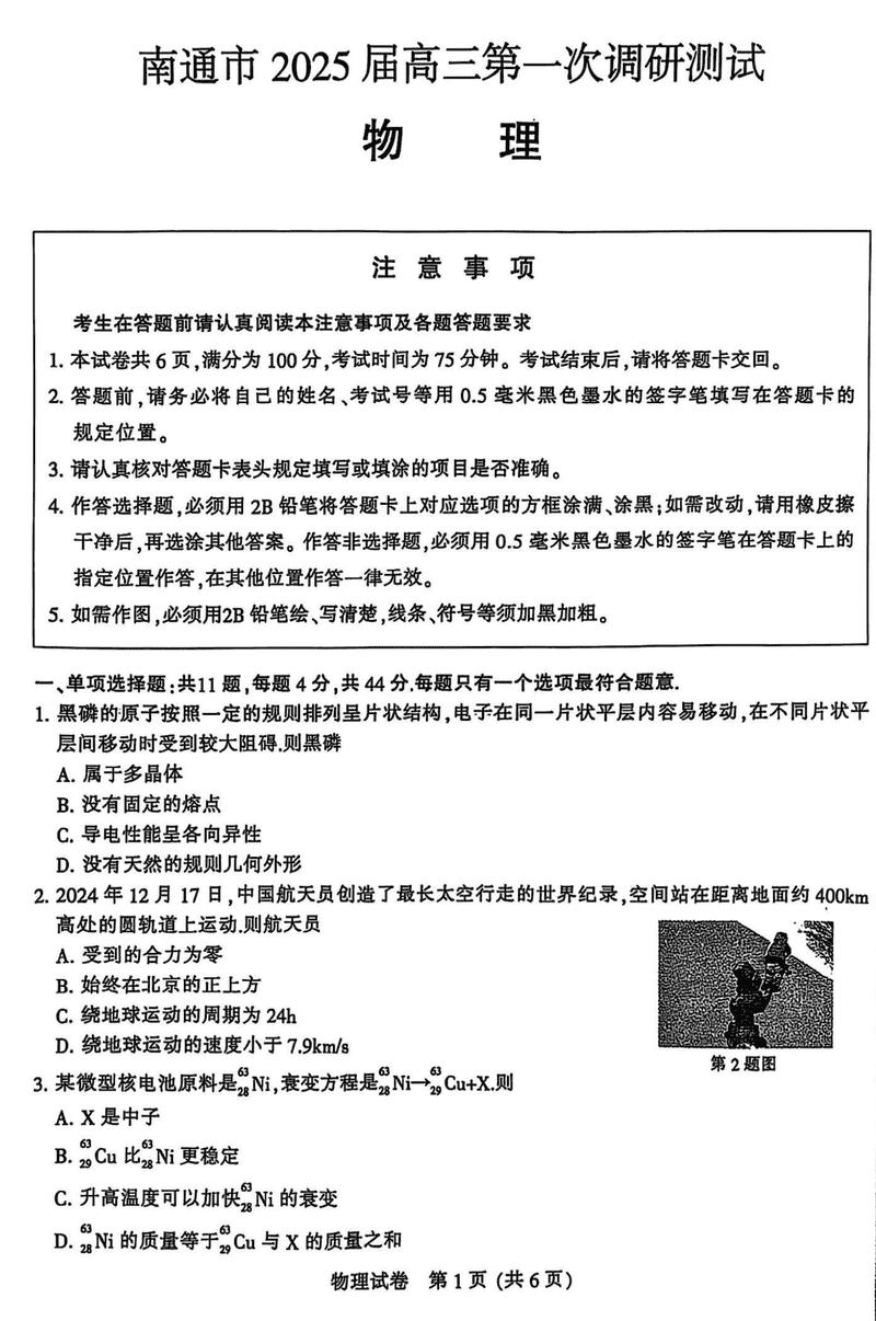 江苏南通2025年高三上学期一模物理试题及答案 时间:2025-01-20 江苏 理综试题 江苏南通2025年高三上学期一模物理考试已于近日开考,为方便考生考后及时查看考试情况,查漏补缺、弥补不足,本文整理了试题答案解析相关信息! 汇总:江苏南通2025年高三上学期一模试题及答案汇总 物理试题及答案解析