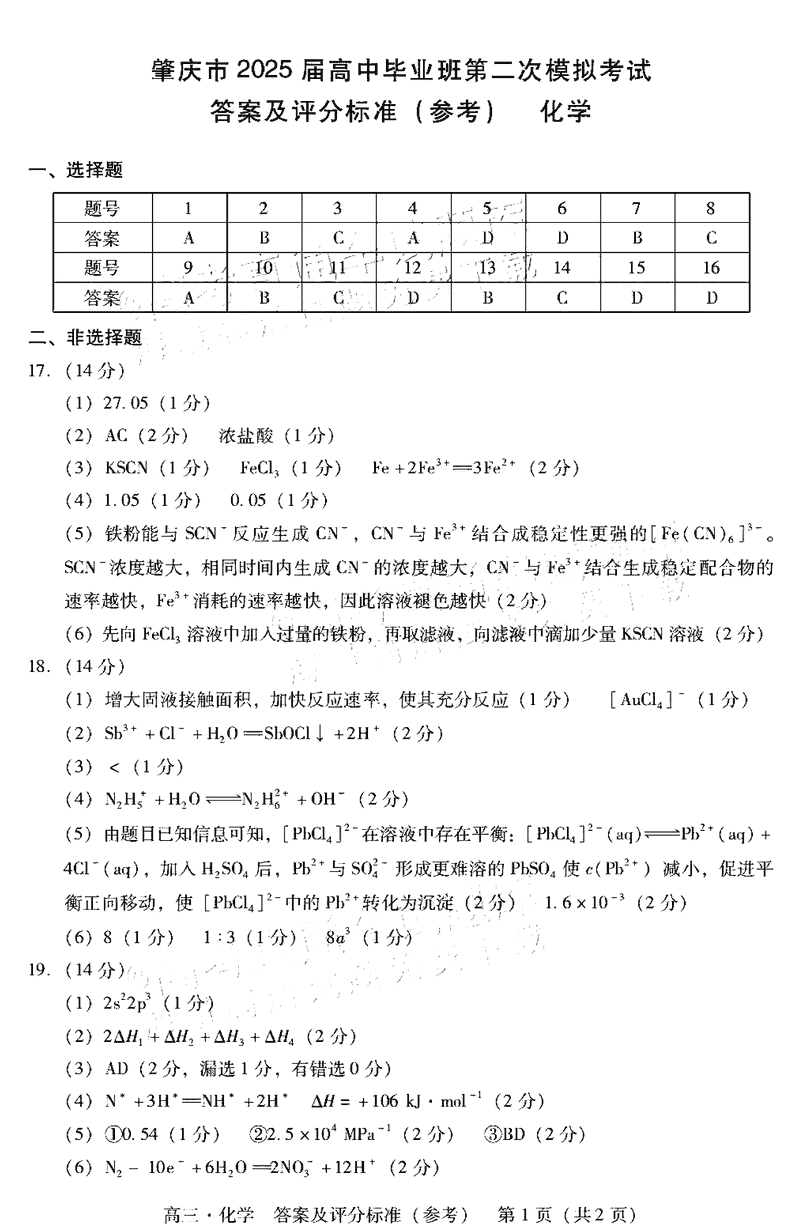 肇庆市2025届高三第二次模考暨汕尾期末化学试题及答案