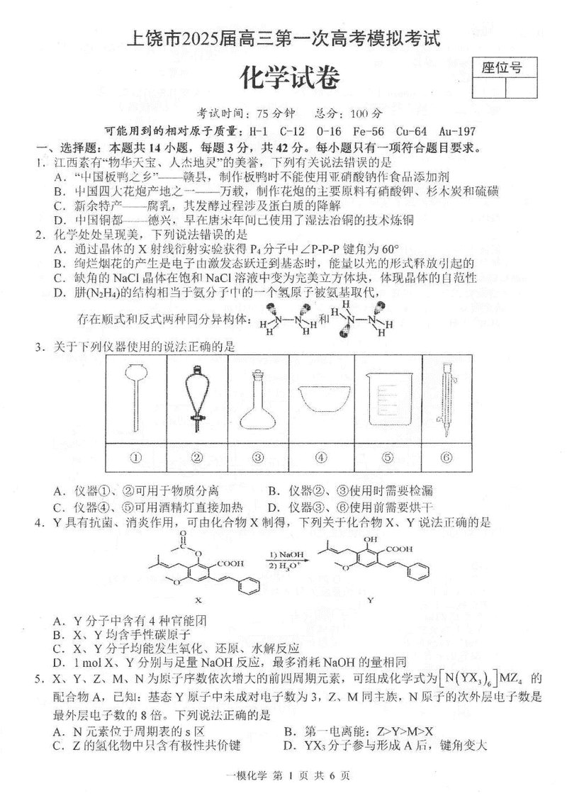 江西上饶2025届高三第一次高考模考化学考试已于近日开考,为方便考生考后及时查看考试情况,查漏补缺、弥补不足,本文整理了试题答案解析相关信息!
