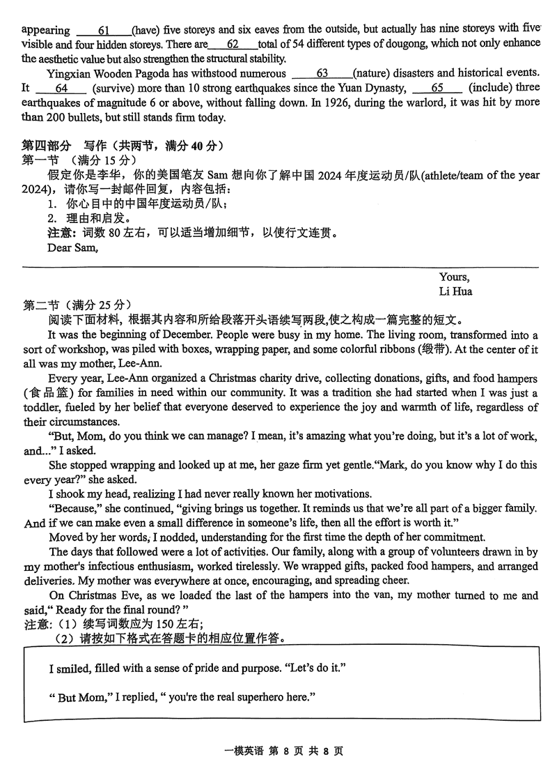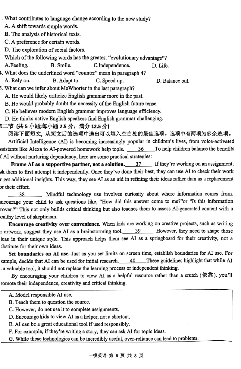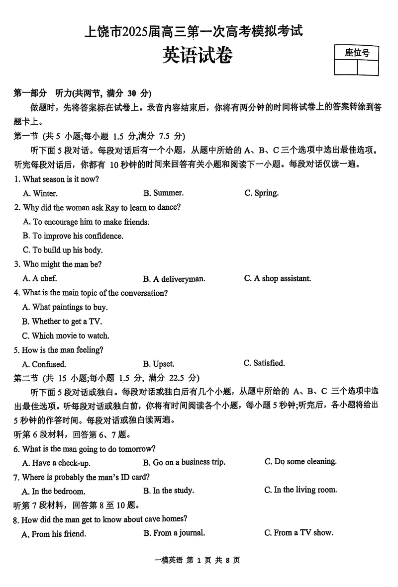 江西上饶2025届高三第一次模考英语试题及答案