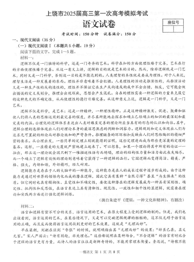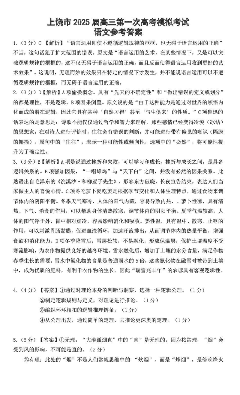 江西上饶2025届高三第一次高考模考语文考试已于近日开考,为方便考生考后及时查看考试情况,查漏补缺、弥补不足,本文整理了试题答案解析相关信息!