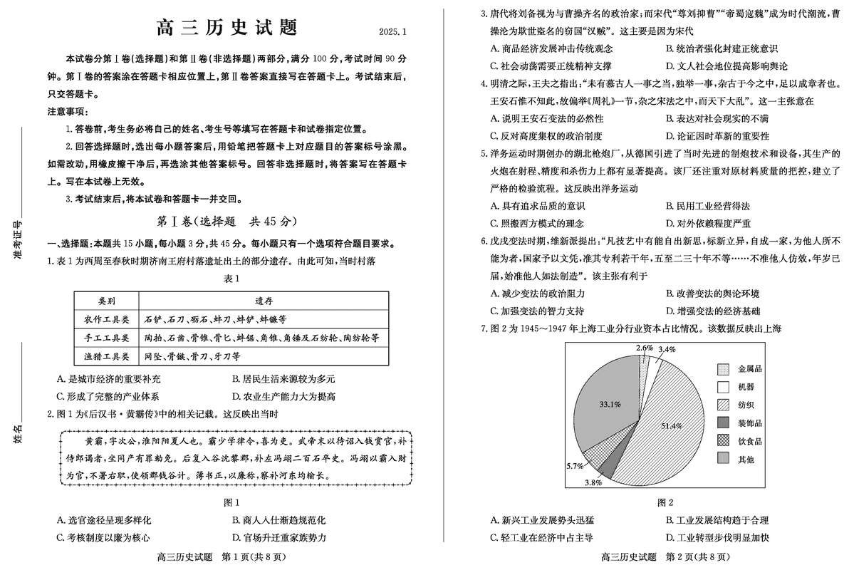 山东德州2025年高三上学期1月期末历史考试已于近日开考,为方便考生考后及时查看考试情况,查漏补缺、弥补不足,本文整理了试题答案解析相关信息!