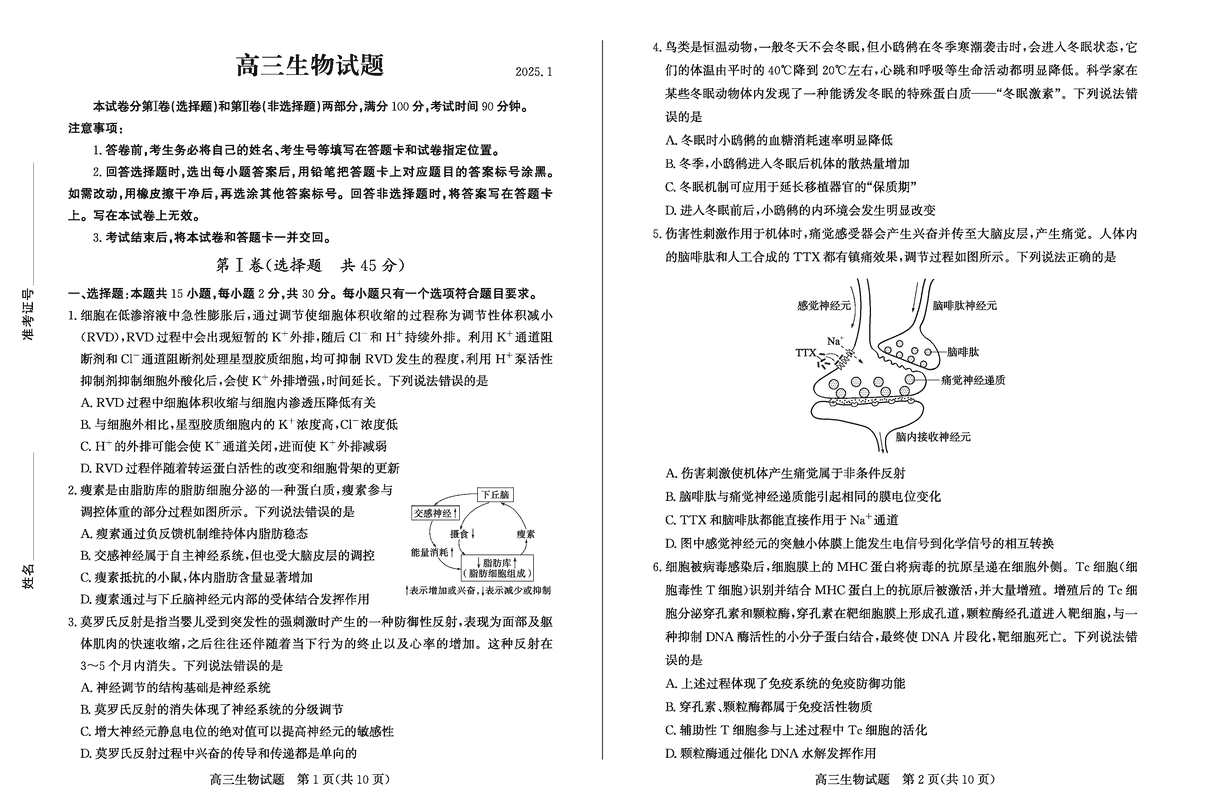 山东德州2025年高三上学期1月期末生物考试已于近日开考,为方便考生考后及时查看考试情况,查漏补缺、弥补不足,本文整理了试题答案解析相关信息!