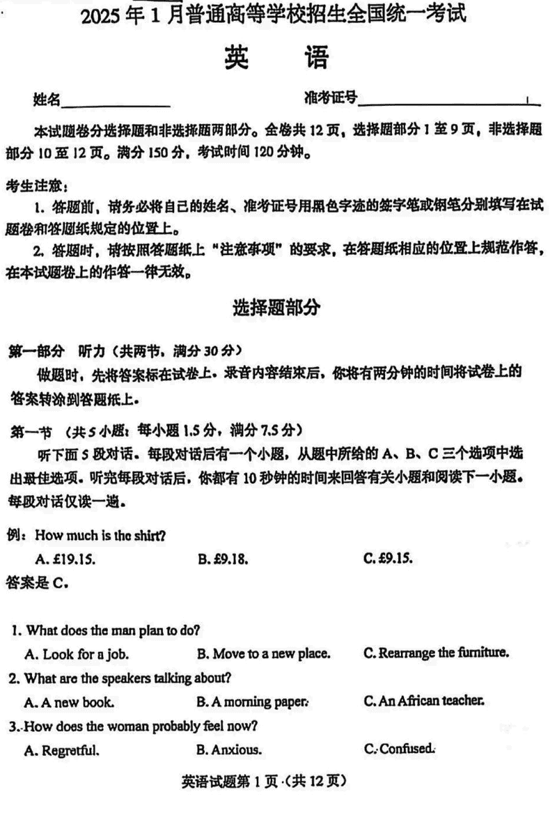 浙江首考2025年1月高三选考科目英语考试已于近日开考,为方便考生考后及时查看考试情况,查漏补缺、弥补不足,本文整理了试题答案解析相关信息!