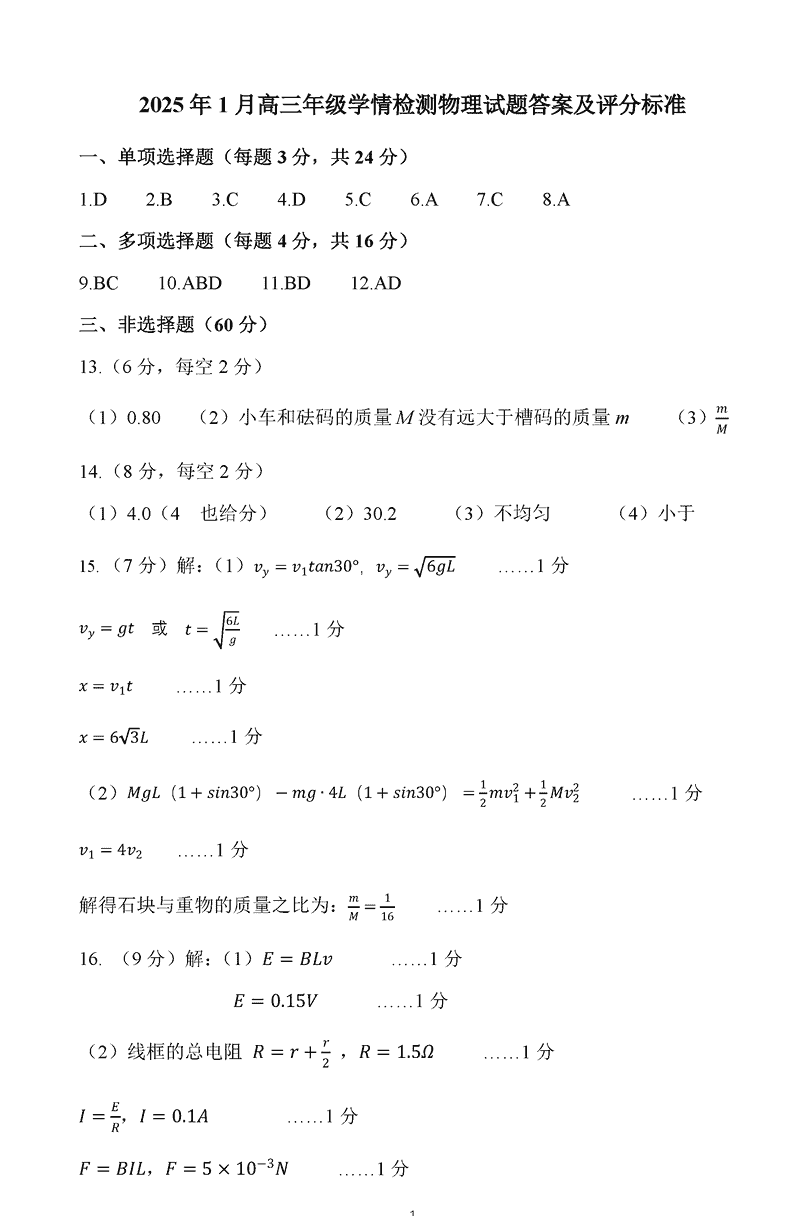 山东济南2025年高三上学期1月期末物理考试已于近日开考,为方便考生考后及时查看考试情况,查漏补缺、弥补不足,本文整理了试题答案解析相关信息!