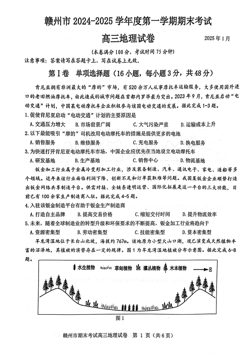 江西赣州2025年1月高三上学期期末地理试题及答案