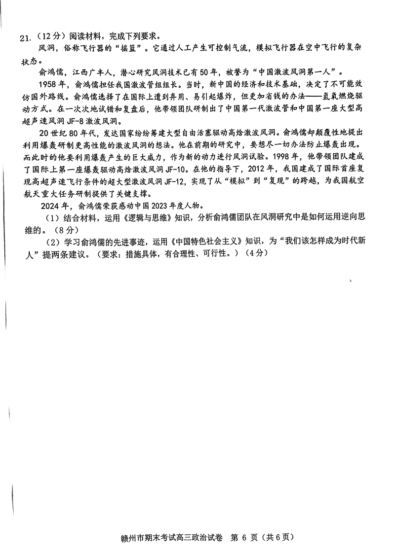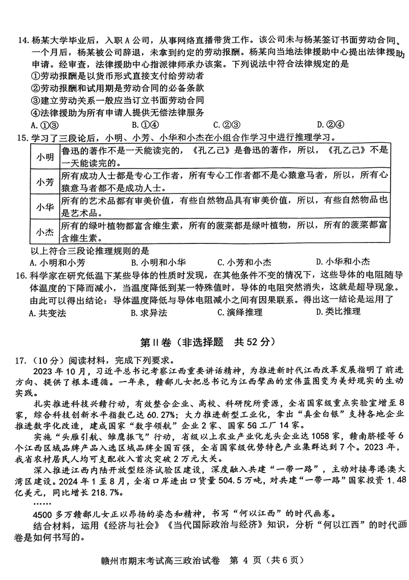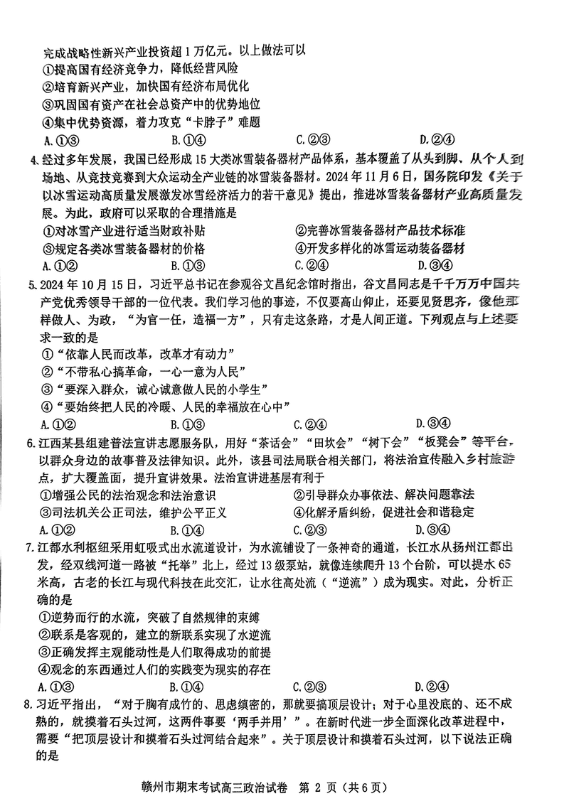 江西赣州2025年1月高三上学期期末政治试题及答案