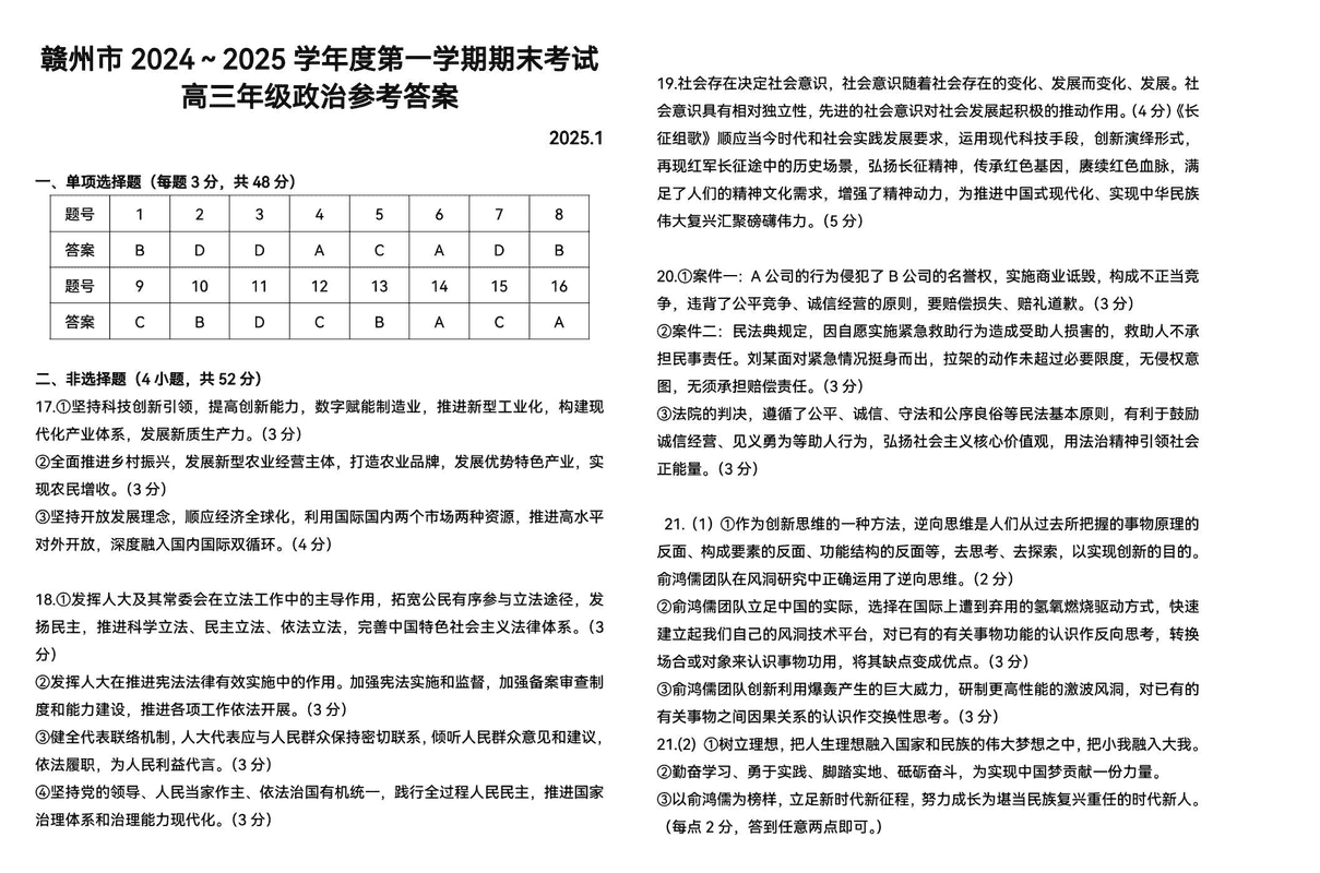 江西赣州2025年1月高三上学期期末政治考试已于近日开考,为方便考生考后及时查看考试情况,查漏补缺、弥补不足,本文整理了试题答案解析相关信息!