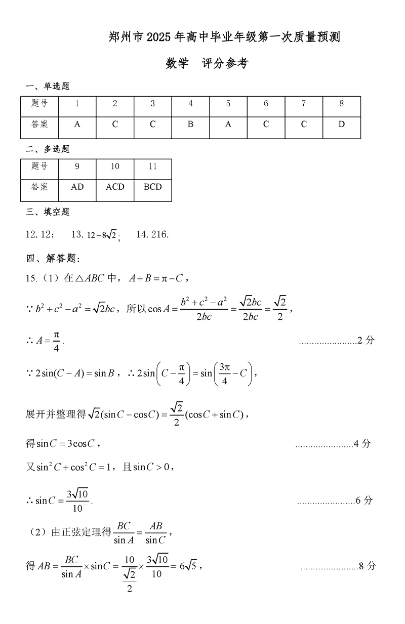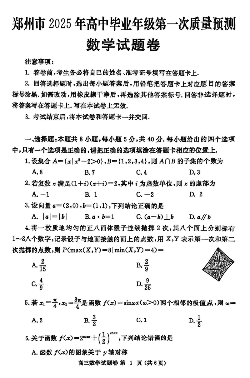 河南郑州2025届高三第一次质量预测数学试题及答案 时间:2025-01-20 河南 数学试题 河南郑州2025届高三第一次质量预测数学考试已于近日开考,为方便考生考后及时查看考试情况,查漏补缺、弥补不足,本文整理了试题答案解析相关信息! 汇总:河南郑州2025届高三第一次质量预测试题及答案汇总 数学试题及答案解析
