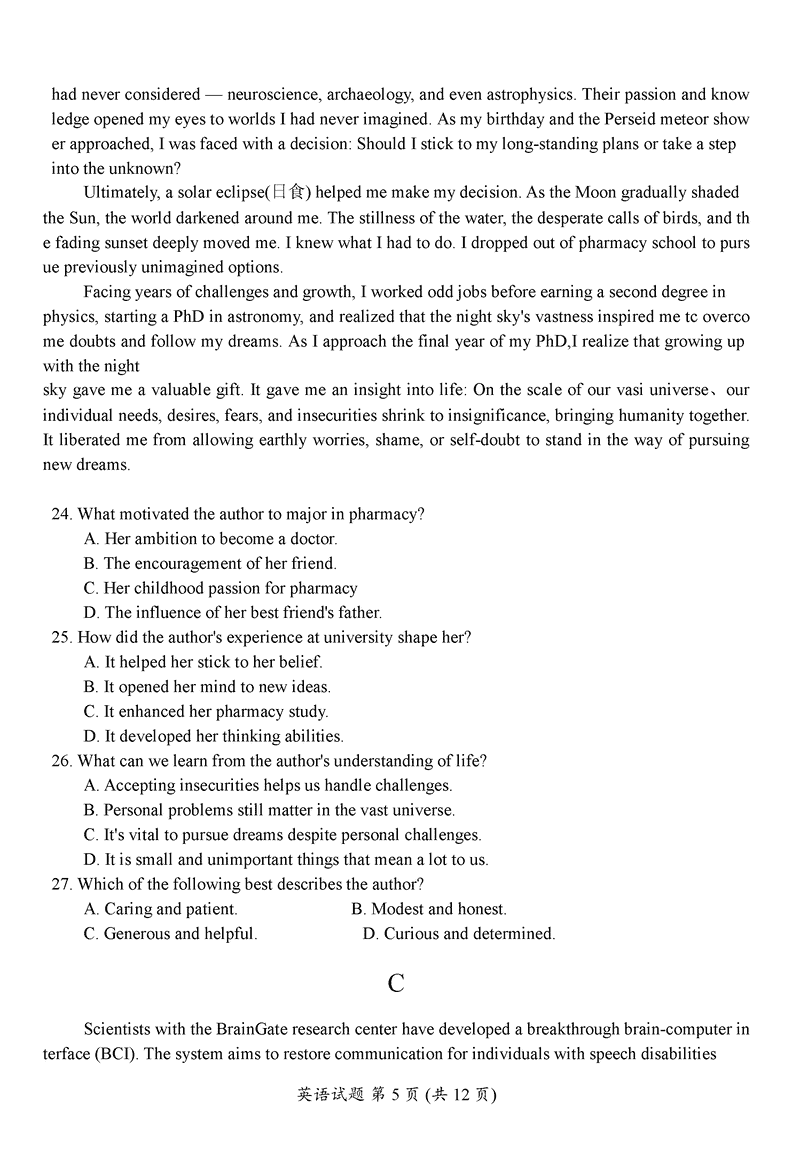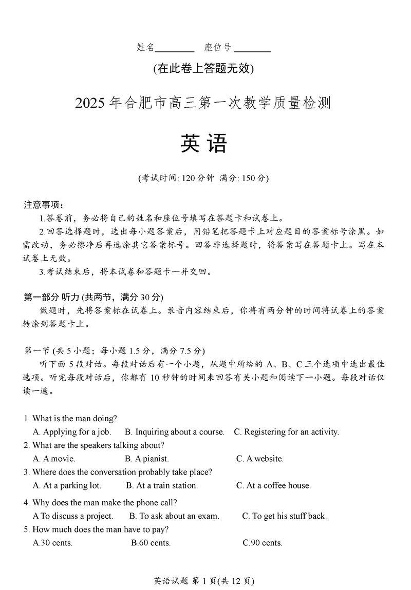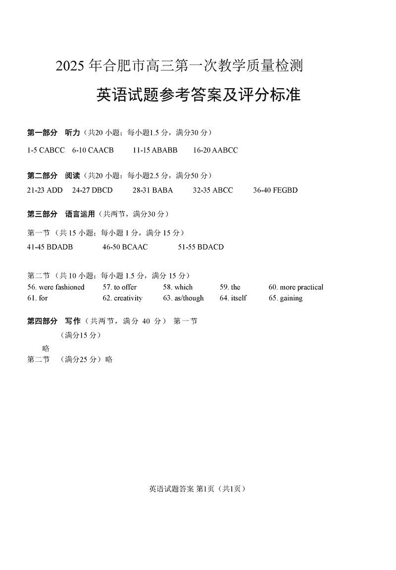 安徽合肥2025届高三第一次教学质检英语试题及答案