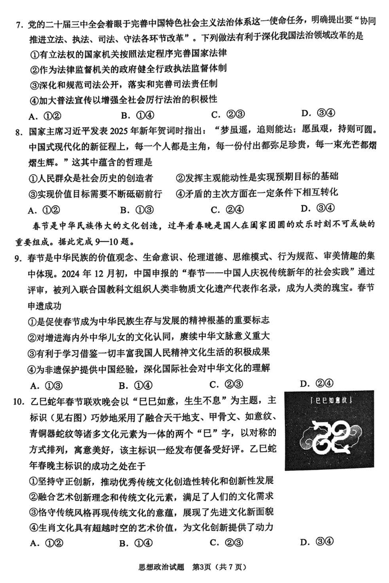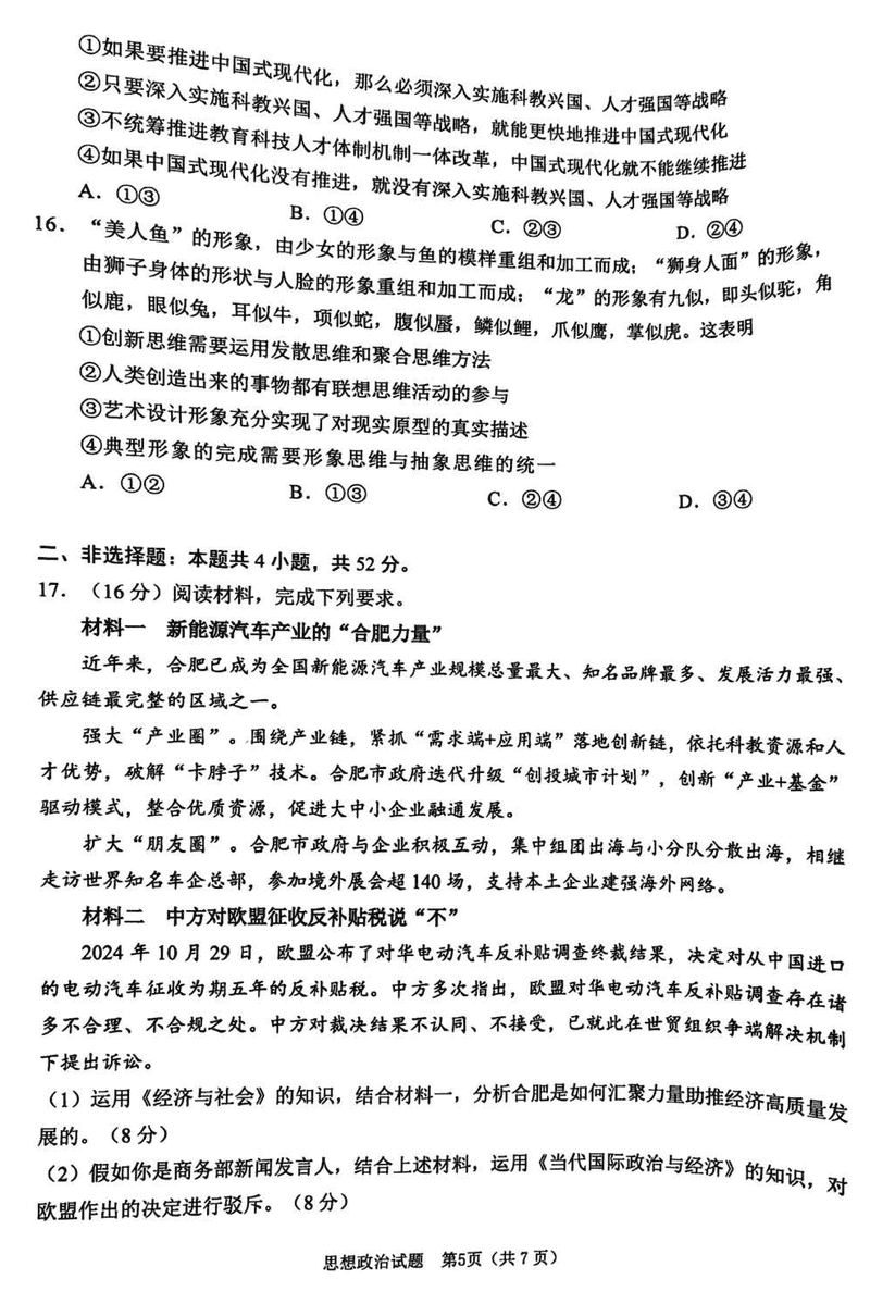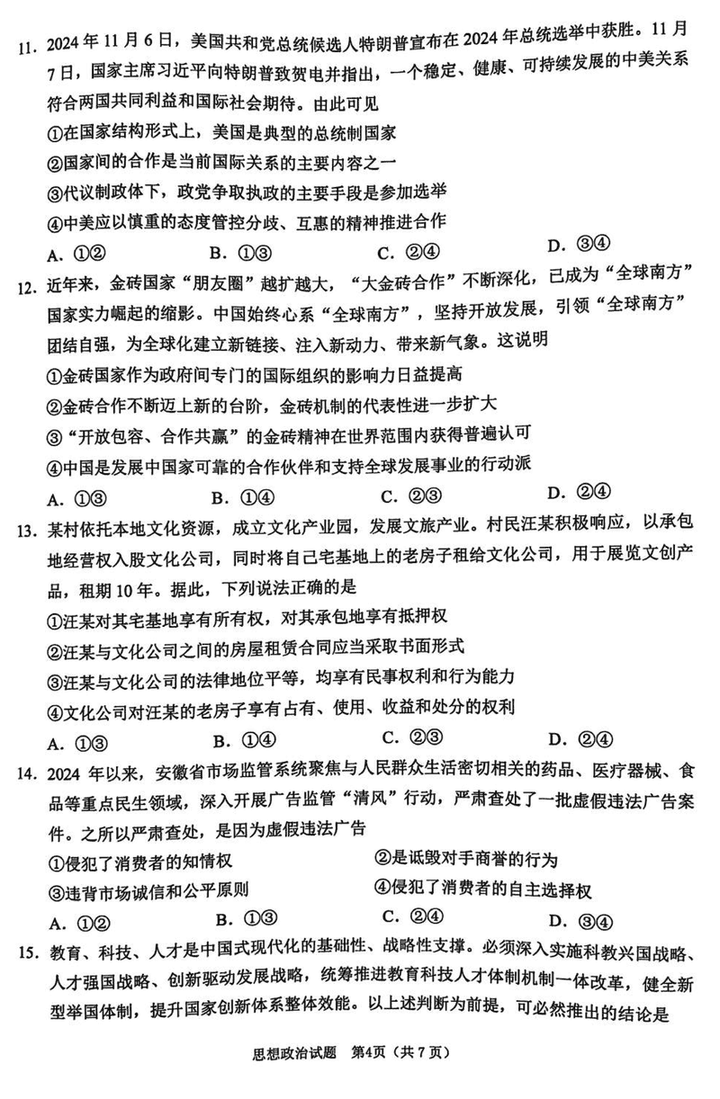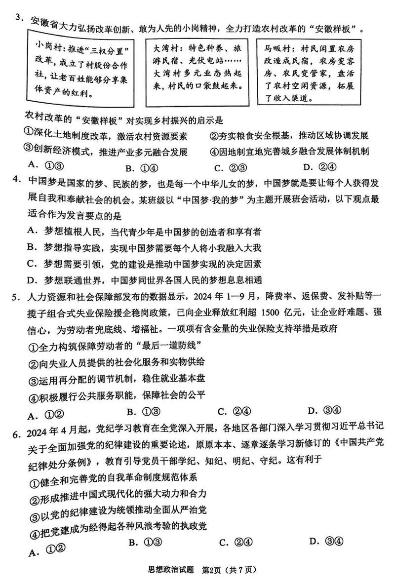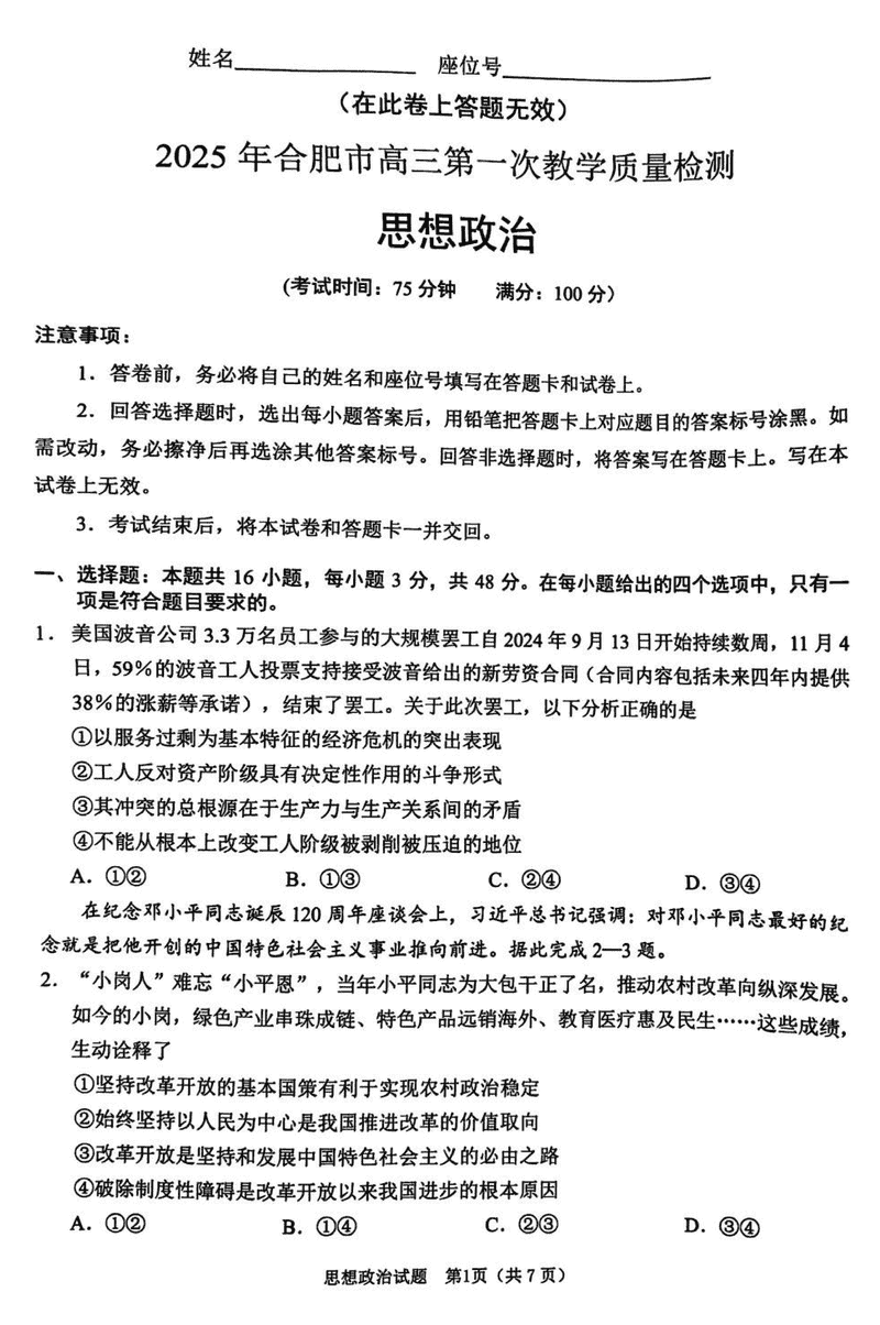 安徽合肥2025届高三第一次教学质检政治试题及答案