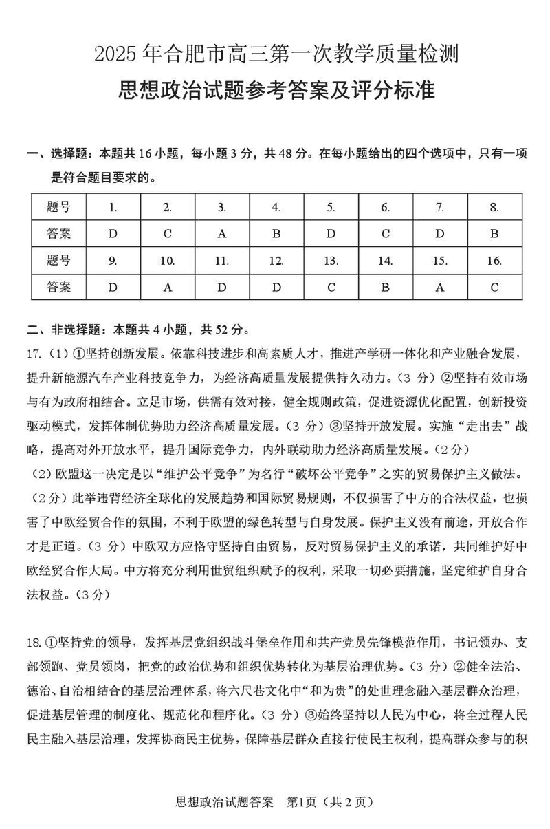 安徽合肥2025届高三第一次教学质检政治考试已于近日开考,为方便考生考后及时查看考试情况,查漏补缺、弥补不足,本文整理了试题答案解析相关信息!