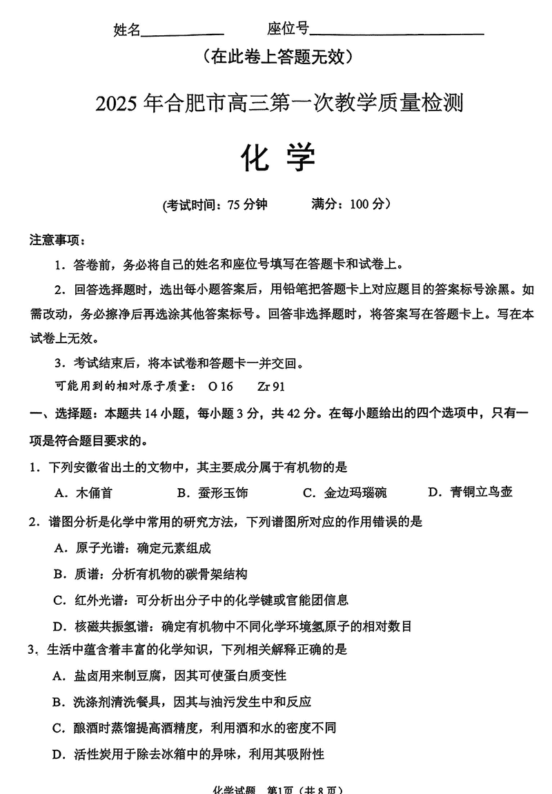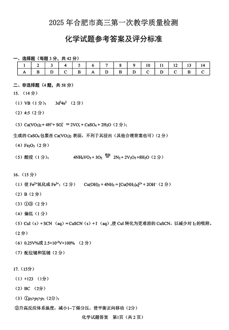 安徽合肥2025届高三第一次教学质检化学考试已于近日开考,为方便考生考后及时查看考试情况,查漏补缺、弥补不足,本文整理了试题答案解析相关信息!