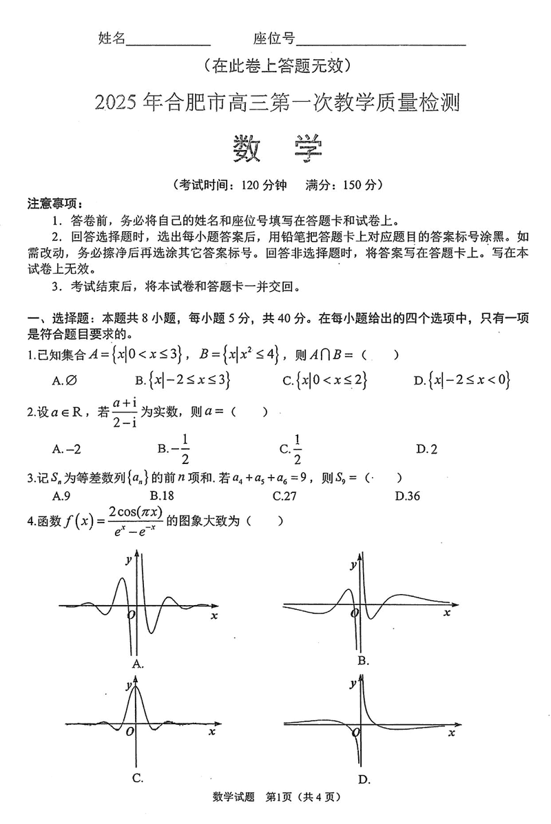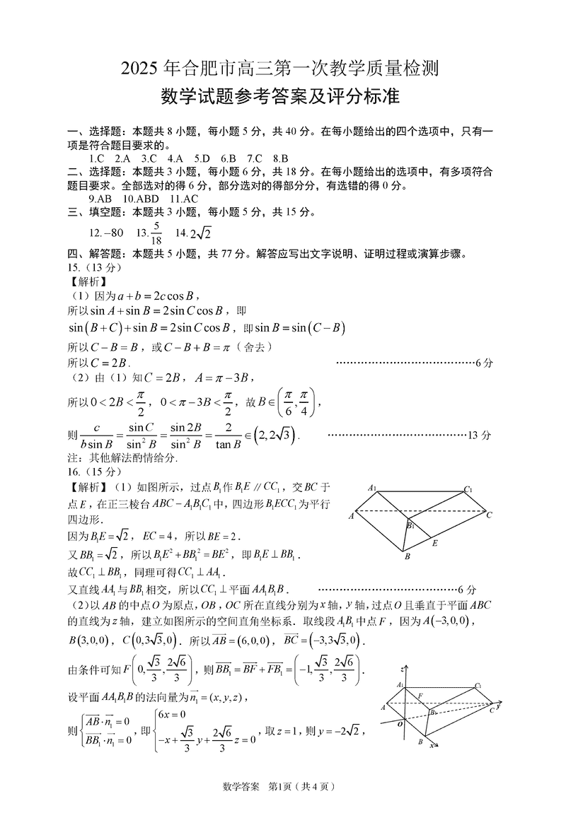 安徽合肥2025届高三第一次教学质检数学试题及答案