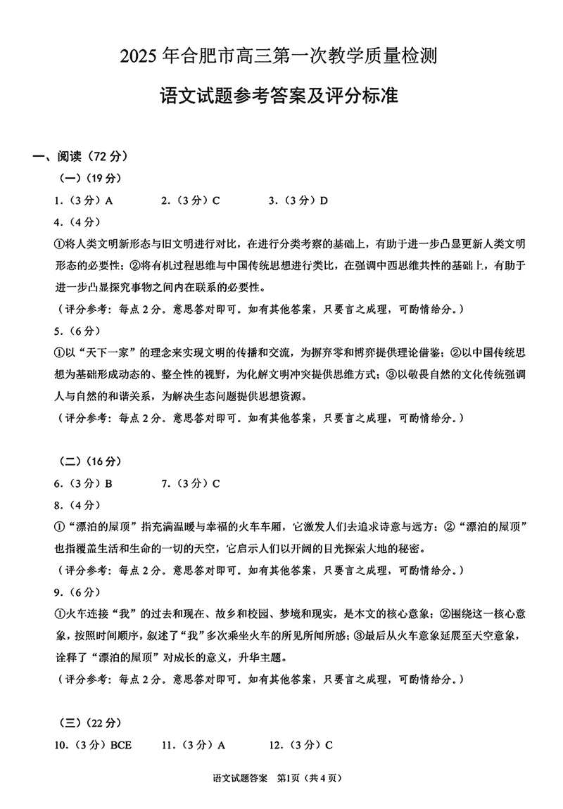 安徽合肥2025届高三第一次教学质检语文考试已于近日开考,为方便考生考后及时查看考试情况,查漏补缺、弥补不足,本文整理了试题答案解析相关信息!