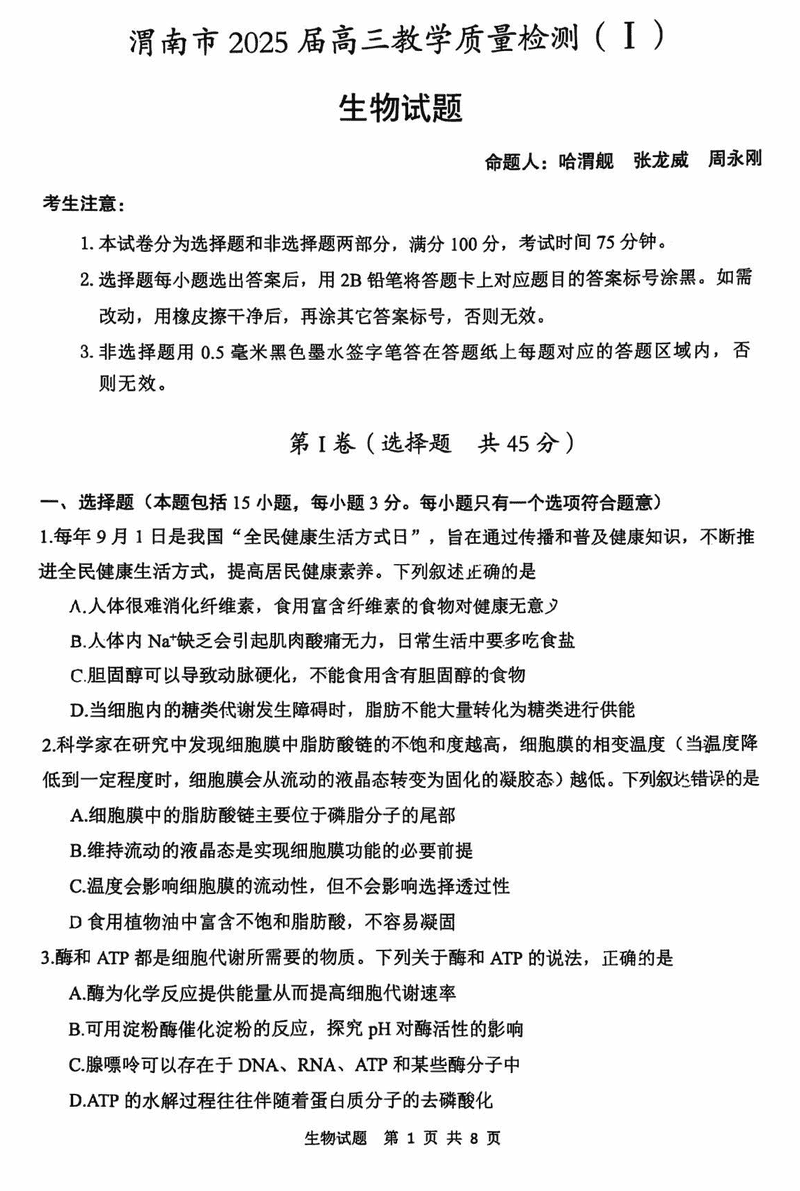 陕西渭南2025届高三上学期教学质量检测Ⅰ生物试题及答案