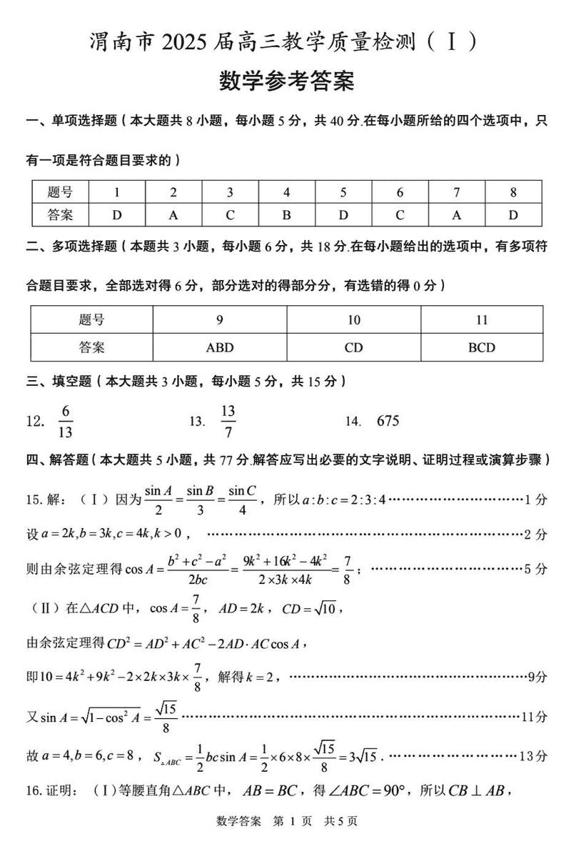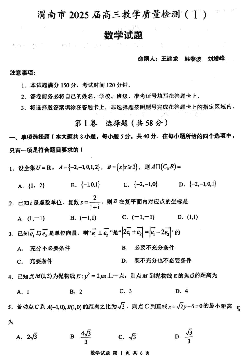 陕西渭南2025届高三上学期教学质量检测Ⅰ数学考试已于近日开考,为方便考生考后及时查看考试情况,查漏补缺、弥补不足,本文整理了试题答案解析相关信息!