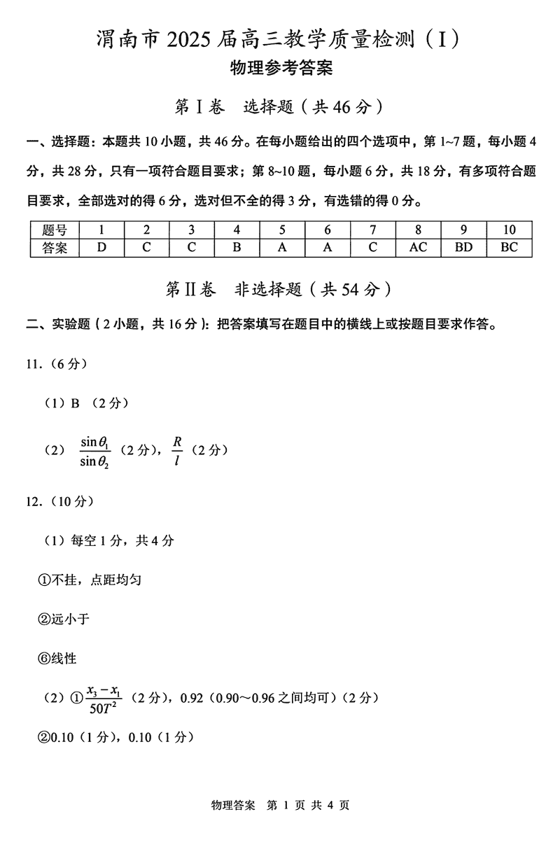 陕西渭南2025届高三上学期教学质量检测Ⅰ物理考试已于近日开考,为方便考生考后及时查看考试情况,查漏补缺、弥补不足,本文整理了试题答案解析相关信息!