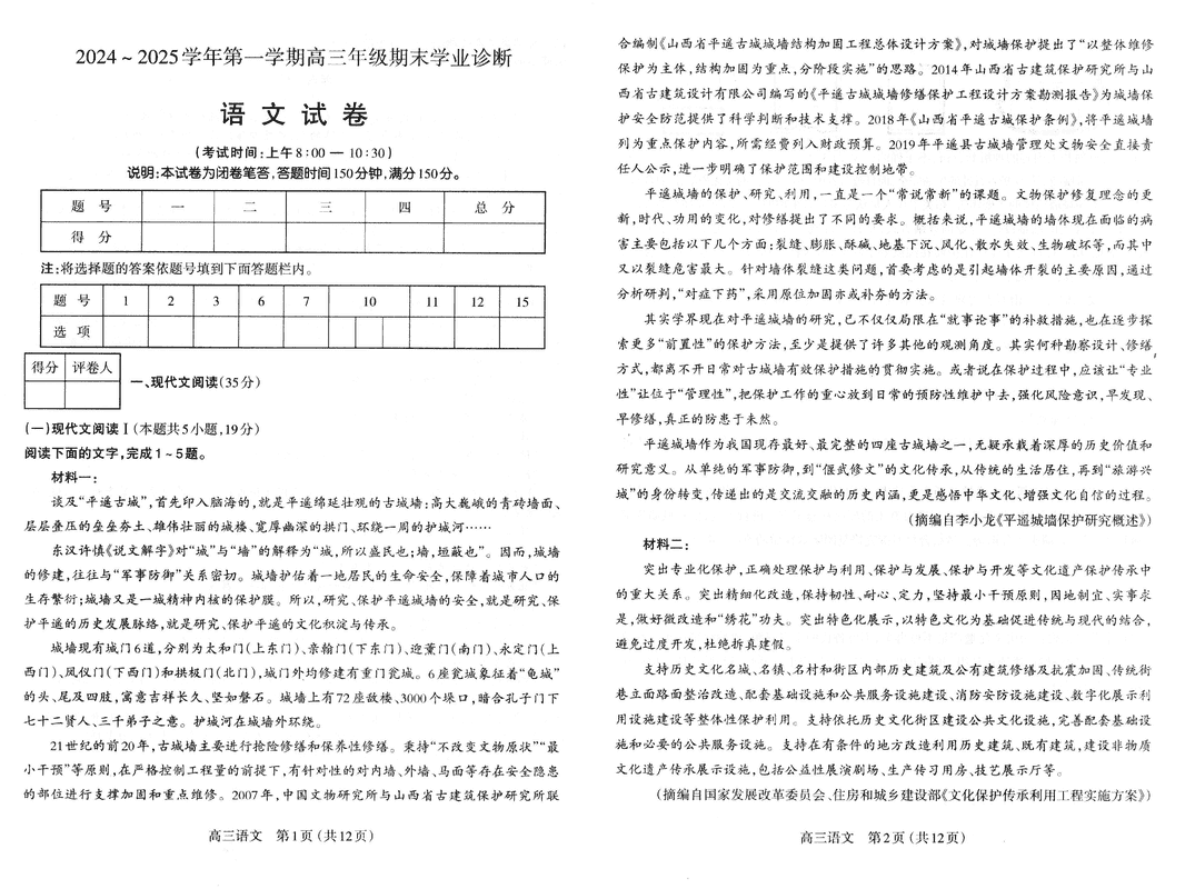 山西太原2024-2025学年高三期末学业诊断语文考试已于近日开考,为方便考生考后及时查看考试情况,查漏补缺、弥补不足,本文整理了试题答案解析相关信息!