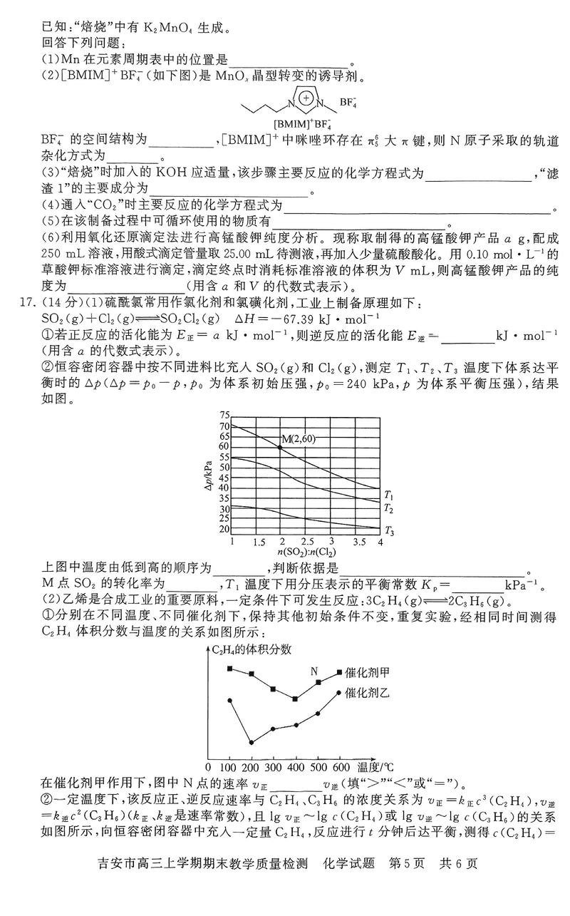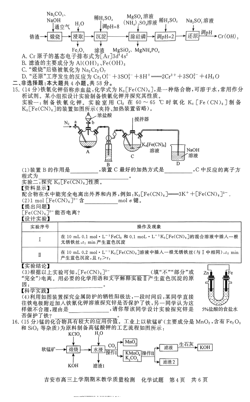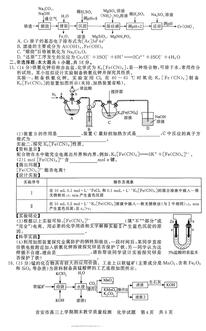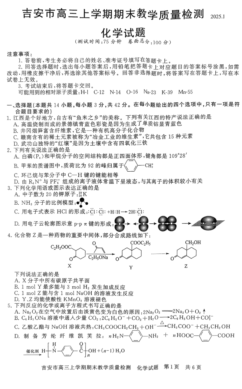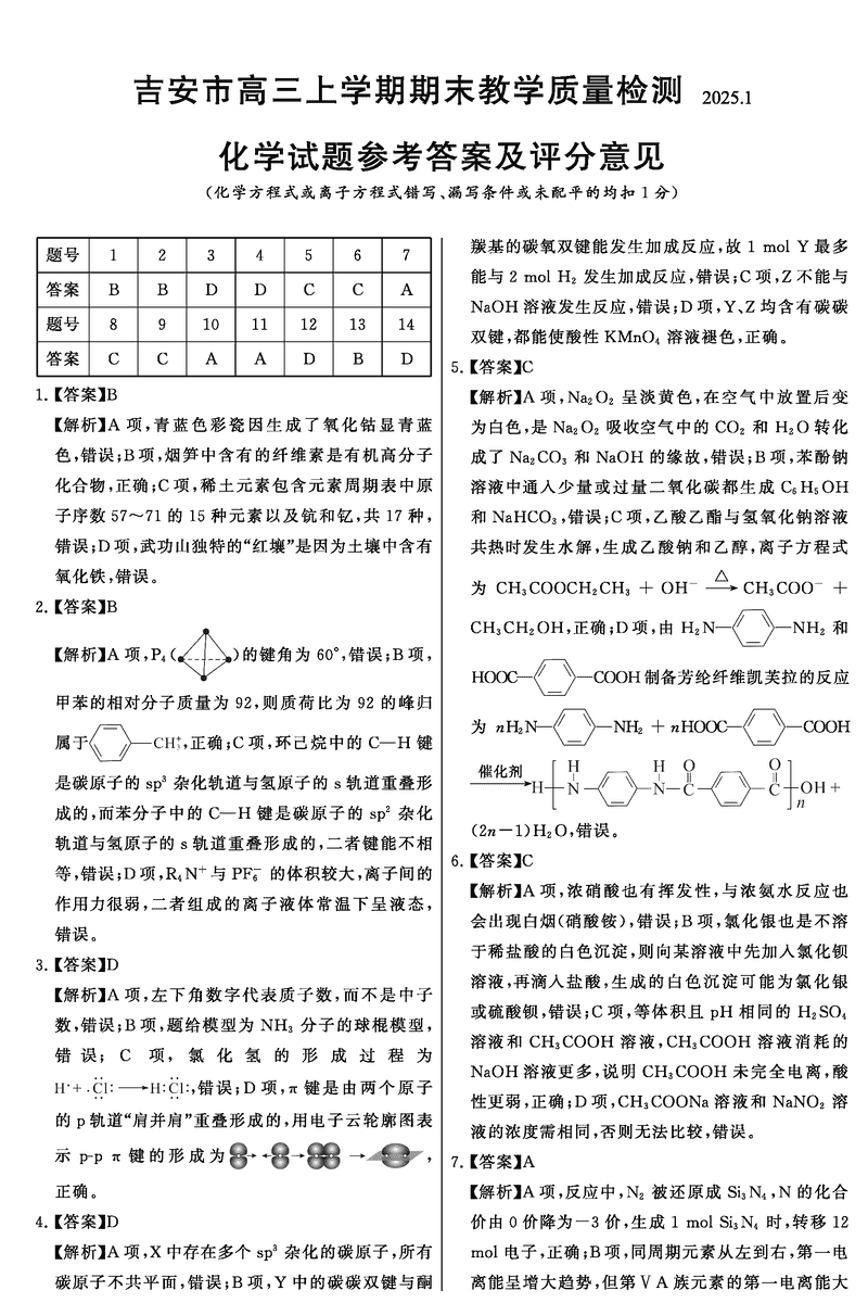 江西吉安2025届高三上1月期末教学质检化学试题及答案