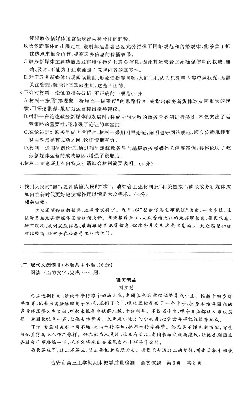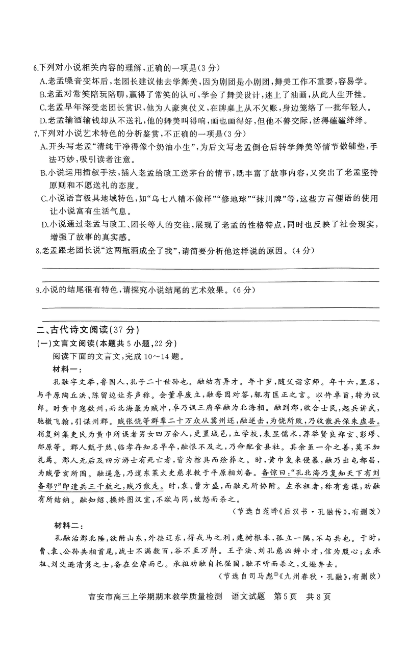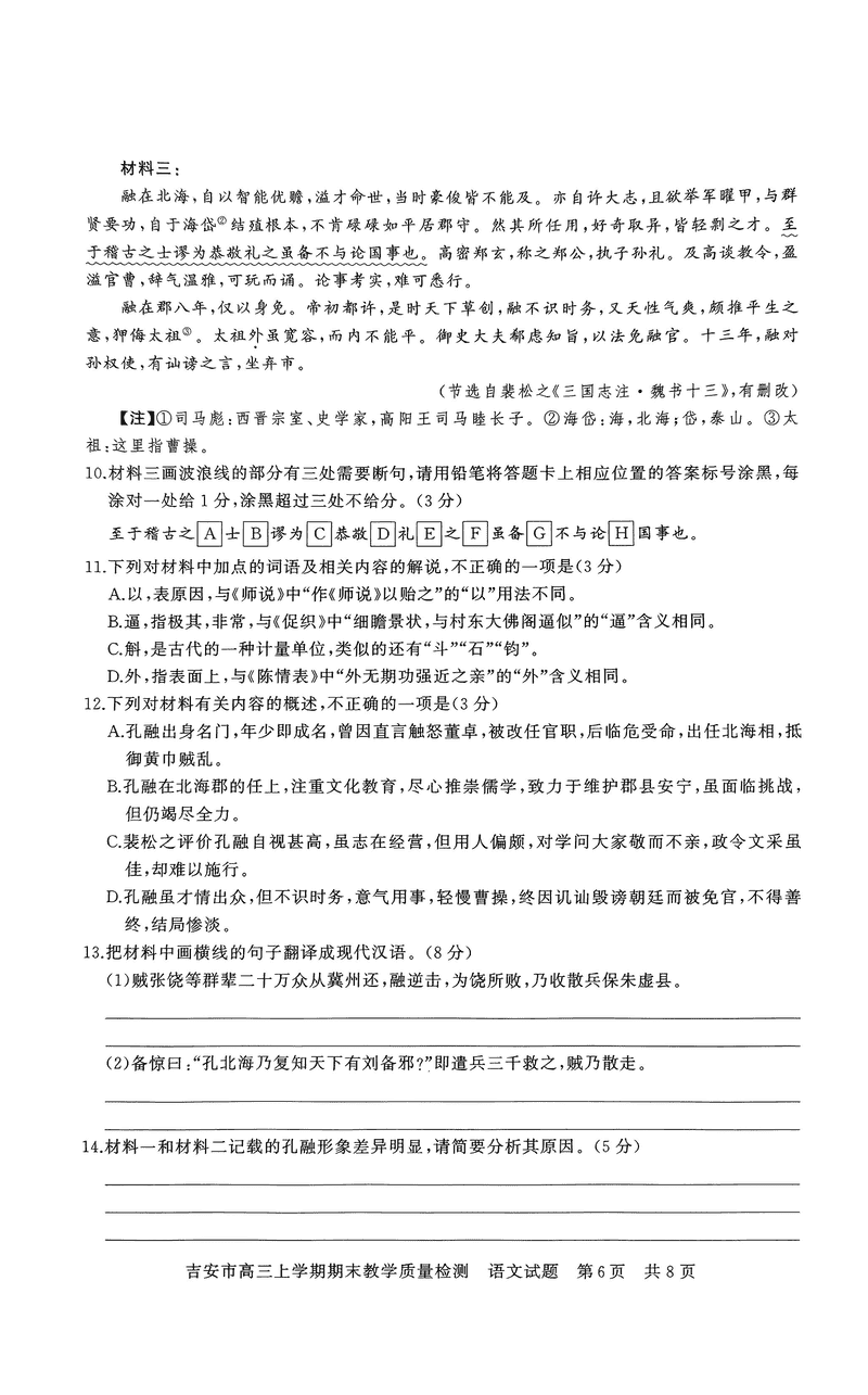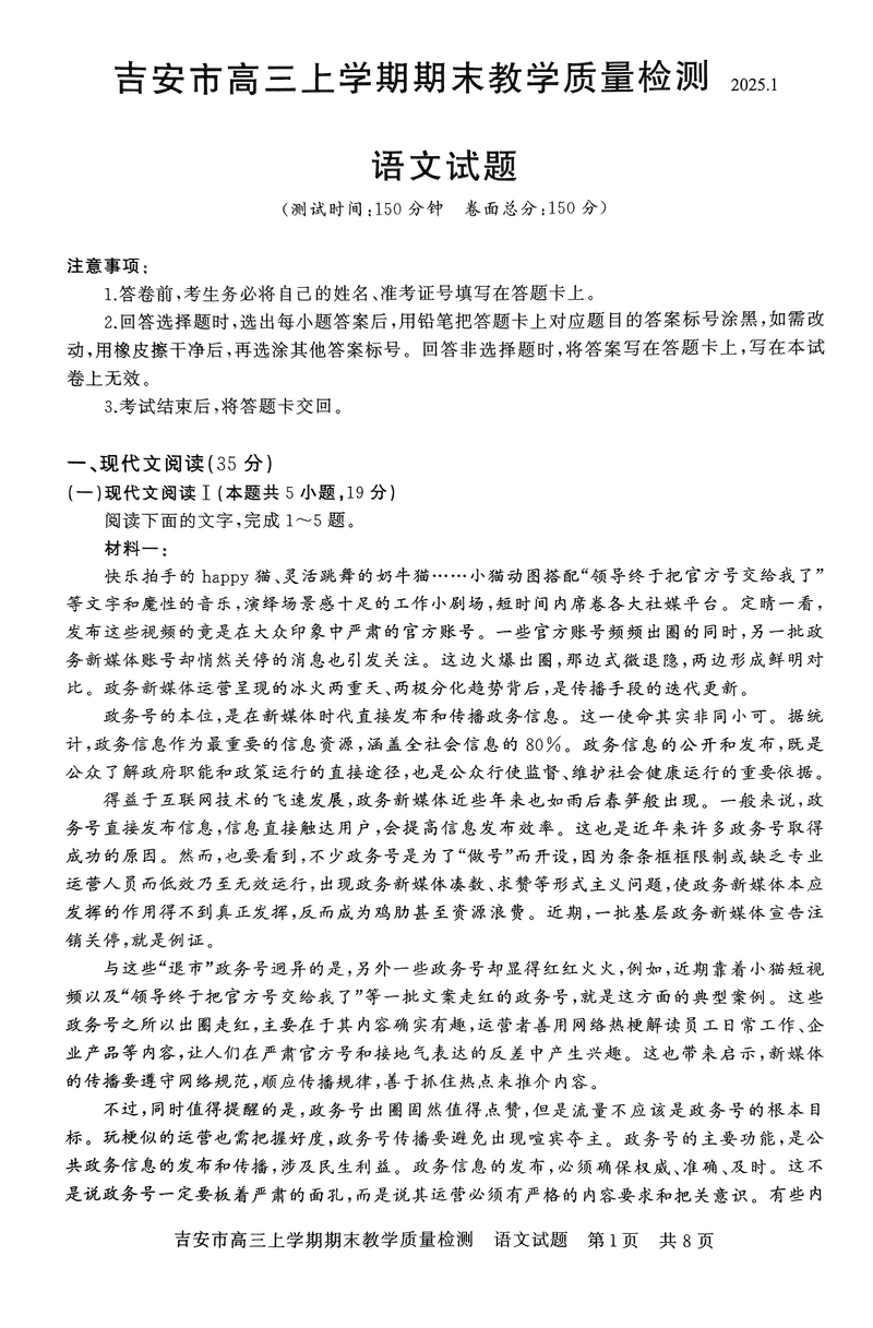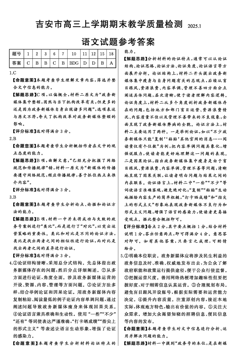 江西吉安2025届高三上1月期末教学质检语文考试已于近日开考,为方便考生考后及时查看考试情况,查漏补缺、弥补不足,本文整理了试题答案解析相关信息!