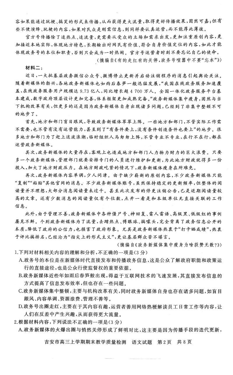 江西吉安2025届高三上1月期末教学质检语文试题及答案