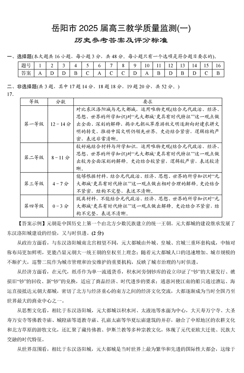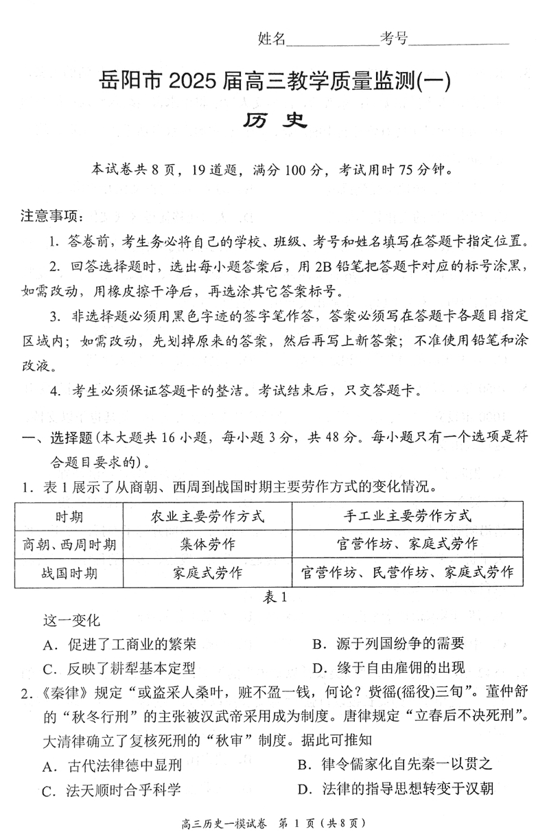 湖南岳阳2025届高三上学期教学质量监测一历史考试已于近日开考,为方便考生考后及时查看考试情况,查漏补缺、弥补不足,本文整理了试题答案解析相关信息!