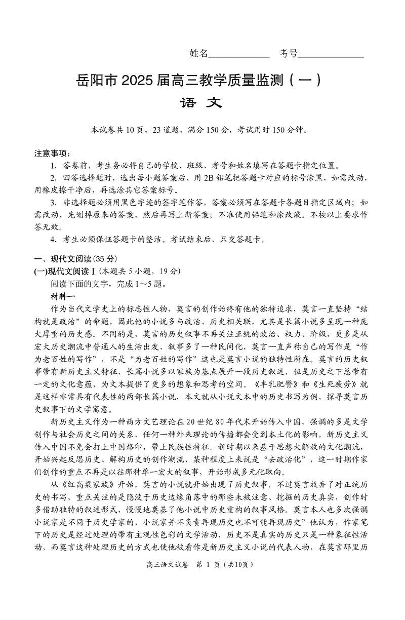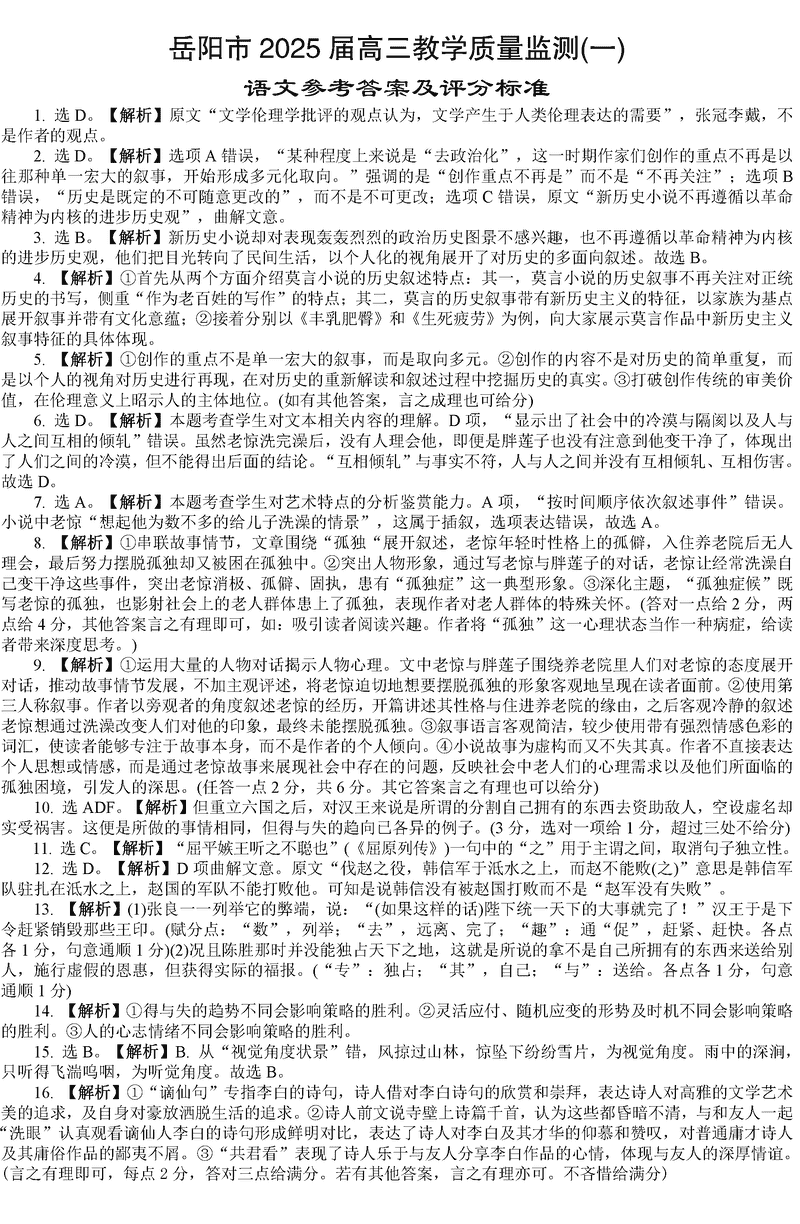 湖南岳阳2025届高三上学期教学质量监测一语文考试已于近日开考,为方便考生考后及时查看考试情况,查漏补缺、弥补不足,本文整理了试题答案解析相关信息!