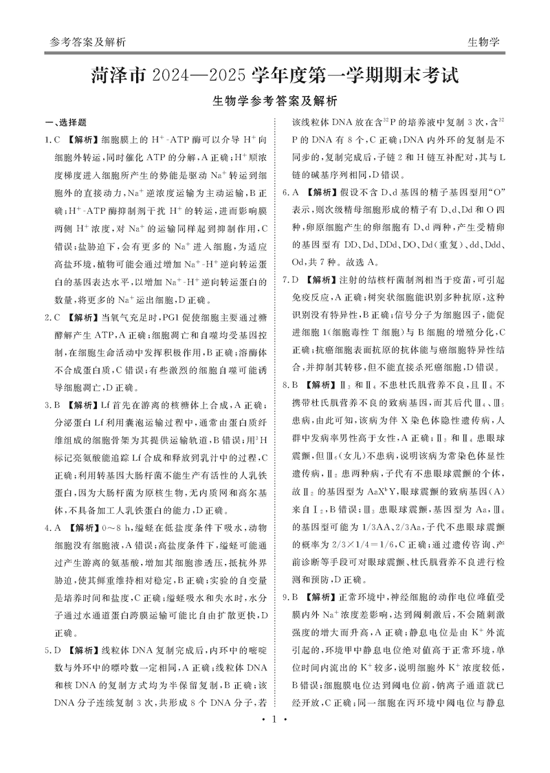 山东菏泽2024-2025学年高三上学期1月期末生物考试已于近日开考,为方便考生考后及时查看考试情况,查漏补缺、弥补不足,本文整理了试题答案解析相关信息!