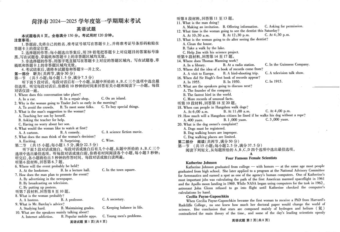 山东菏泽2024-2025学年高三上学期1月期末英语考试已于近日开考,为方便考生考后及时查看考试情况,查漏补缺、弥补不足,本文整理了试题答案解析相关信息!