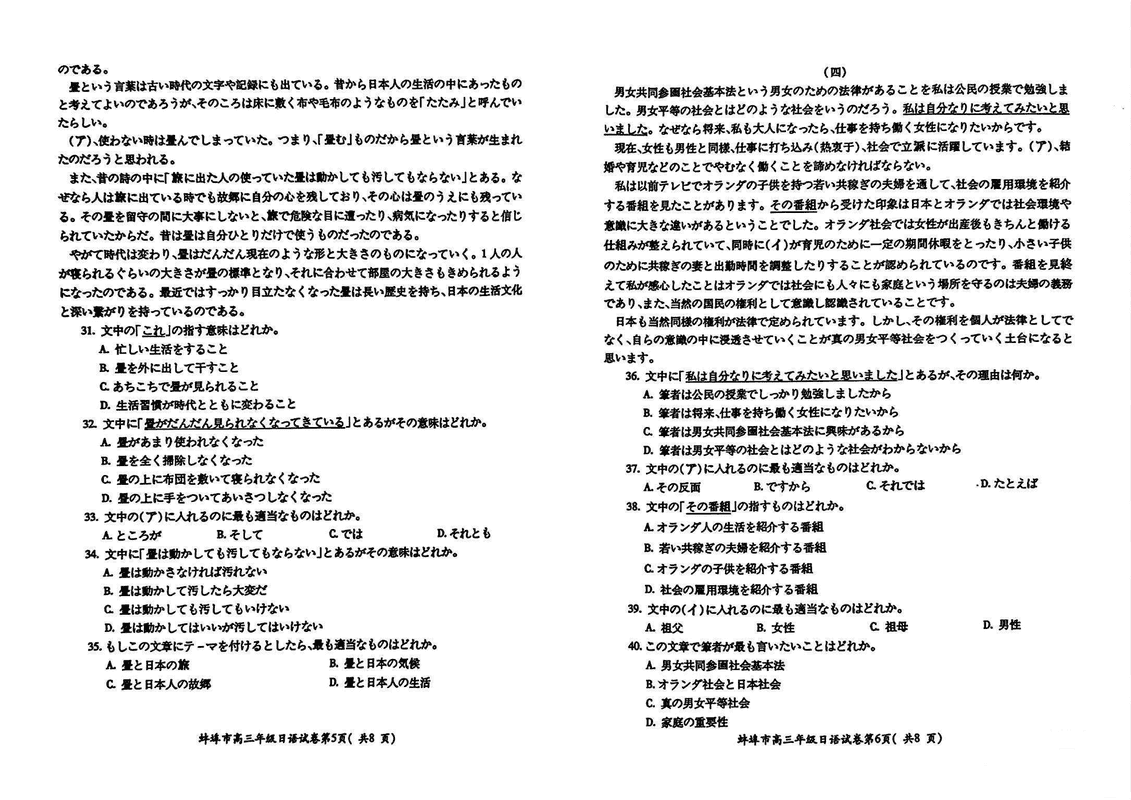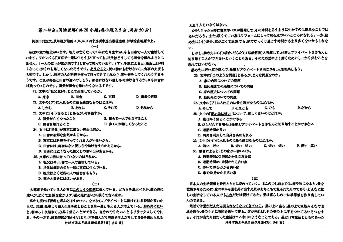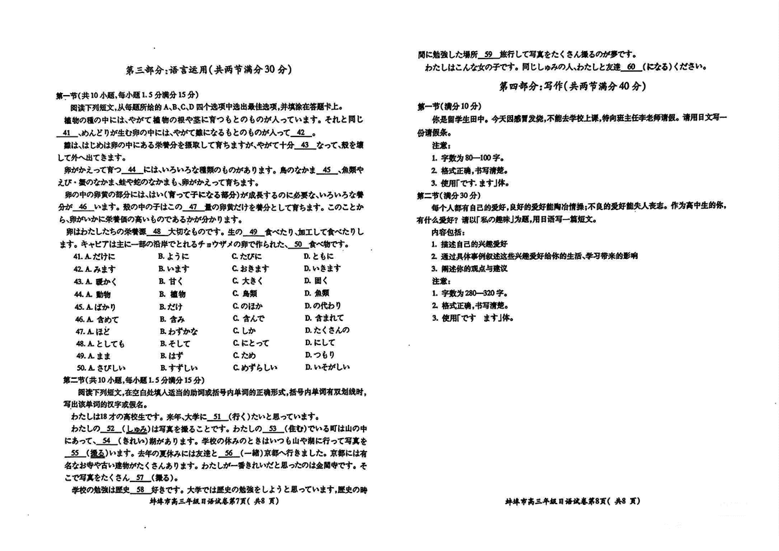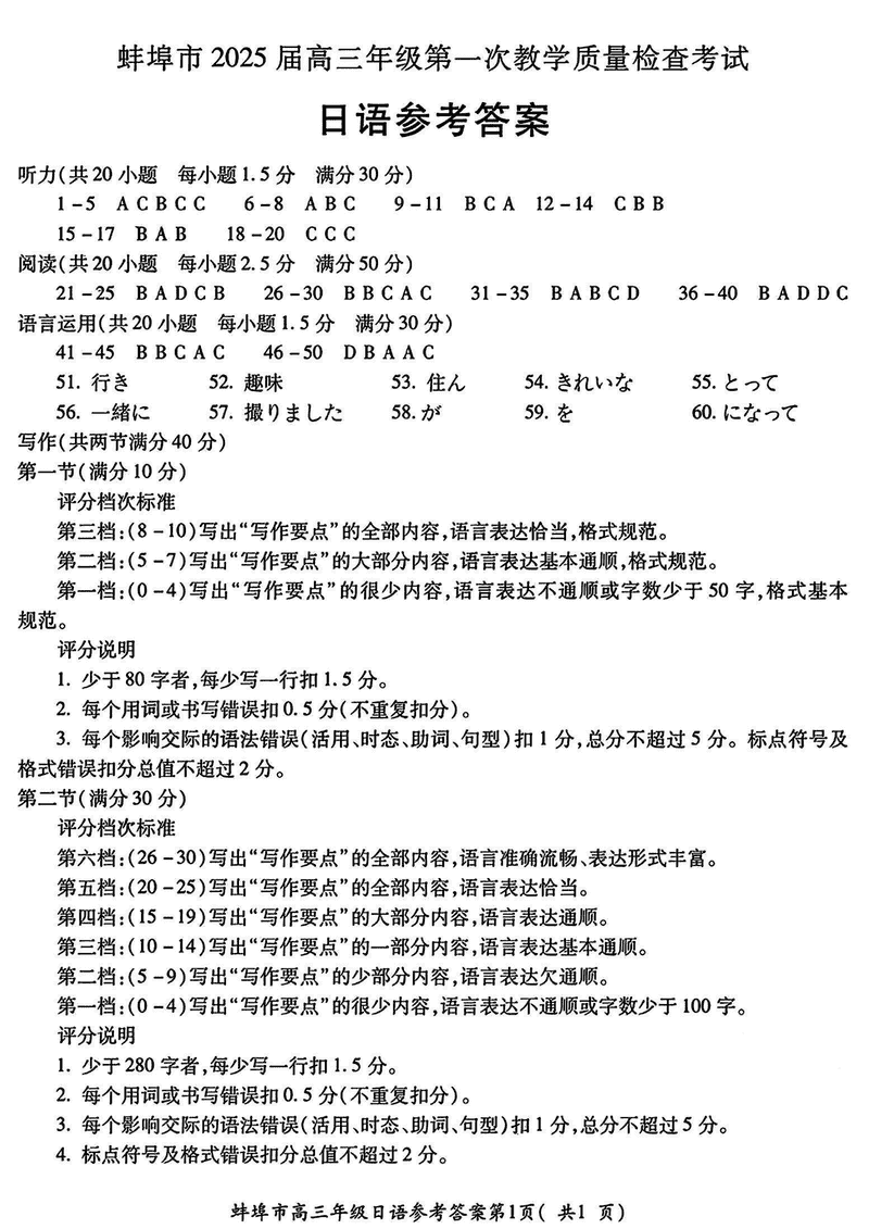 安徽蚌埠2025届高三上学期1月第一次教学质量检查日语试题及答案