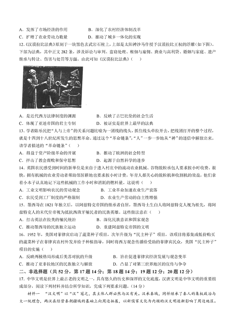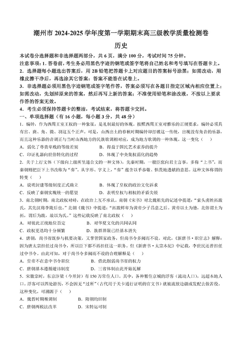 广东潮州2025年高三期末教学质检历史试题及答案 时间:2025-01-24 广东 文综试题 广东潮州2025年高三期末教学质检历史考试已于近日开考,为方便考生考后及时查看考试情况,查漏补缺、弥补不足,本文整理了试题答案解析相关信息! 汇总:广东省潮州市2025年高三期末教学质检试题及答案汇总 历史试题及答案解析