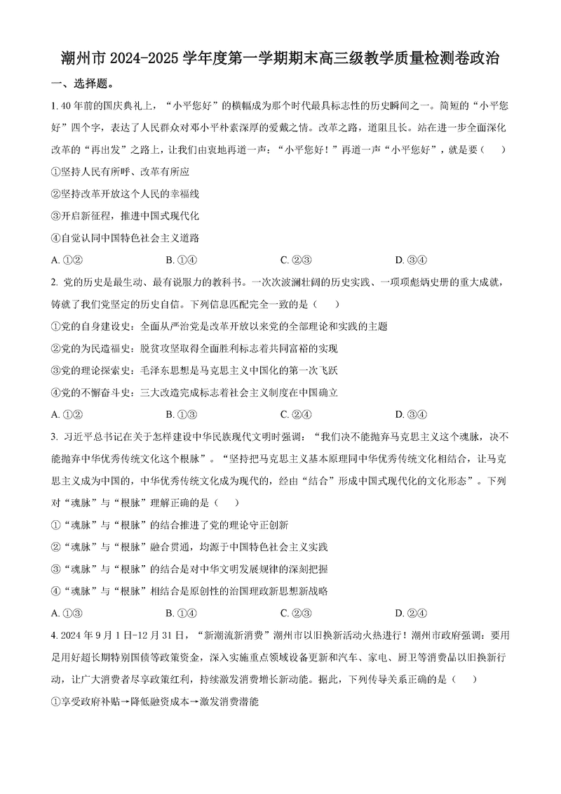 广东潮州2025年高三期末教学质检政治试题及答案 时间:2025-01-24 广东 文综试题 广东潮州2025年高三期末教学质检政治考试已于近日开考,为方便考生考后及时查看考试情况,查漏补缺、弥补不足,本文整理了试题答案解析相关信息! 汇总:广东省潮州市2025年高三期末教学质检试题及答案汇总 政治试题及答案解析