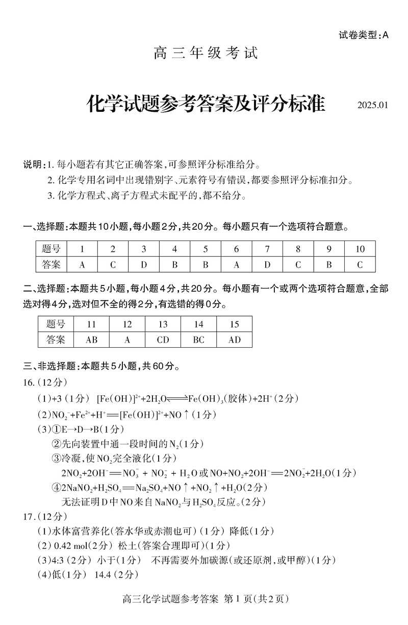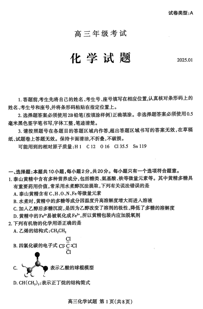 山东泰安2024-2025学年高三上学期1月期末化学考试已于近日开考,为方便考生考后及时查看考试情况,查漏补缺、弥补不足,本文整理了试题答案解析相关信息!