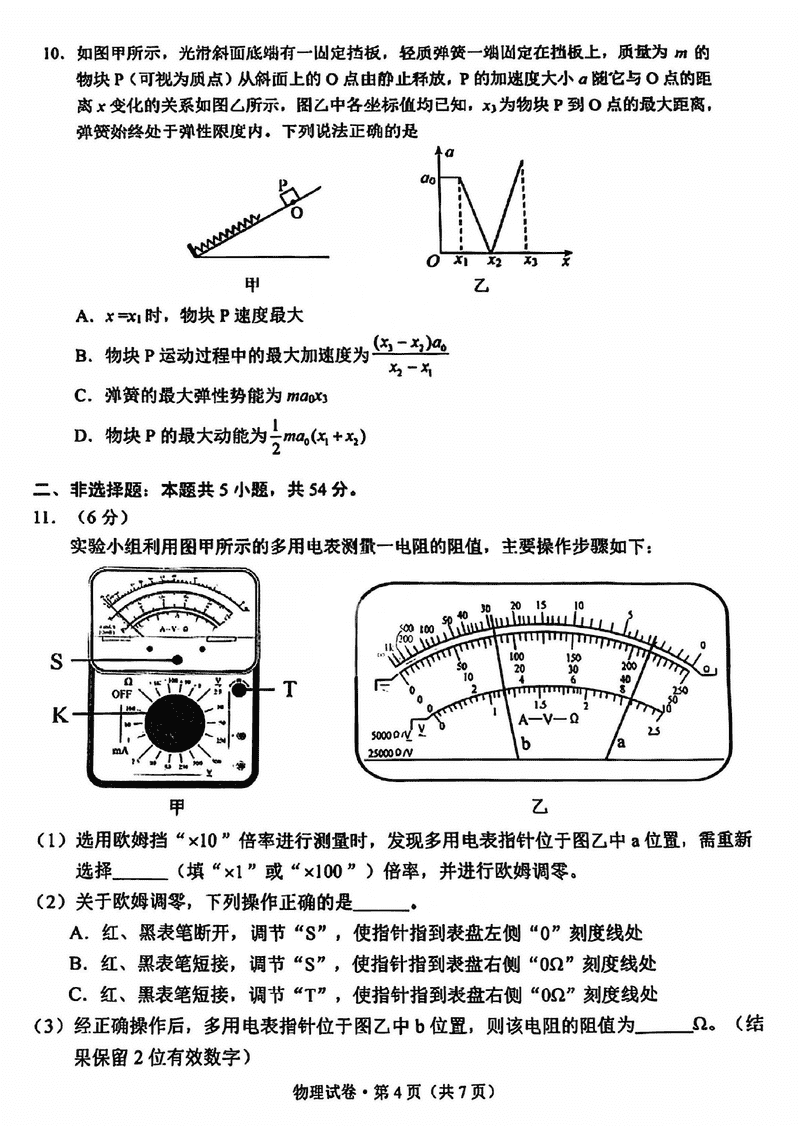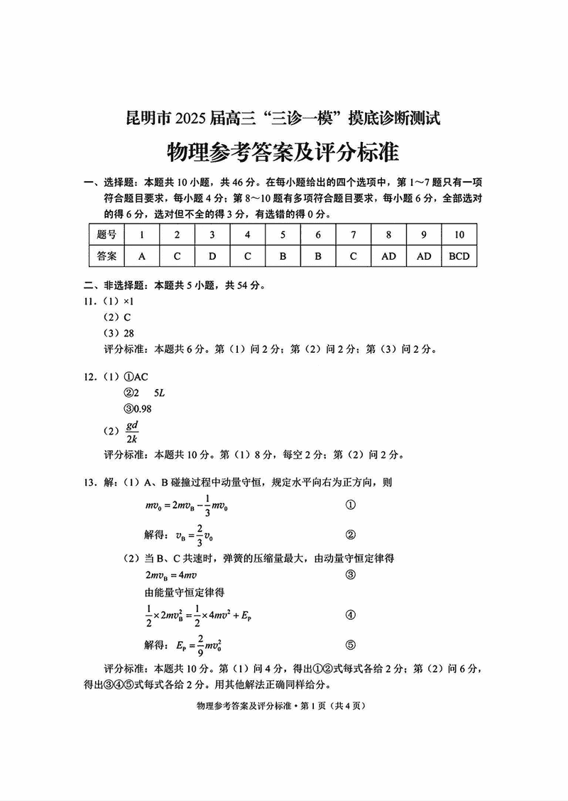 昆明三诊一模2025届高三摸底诊断物理试题及答案