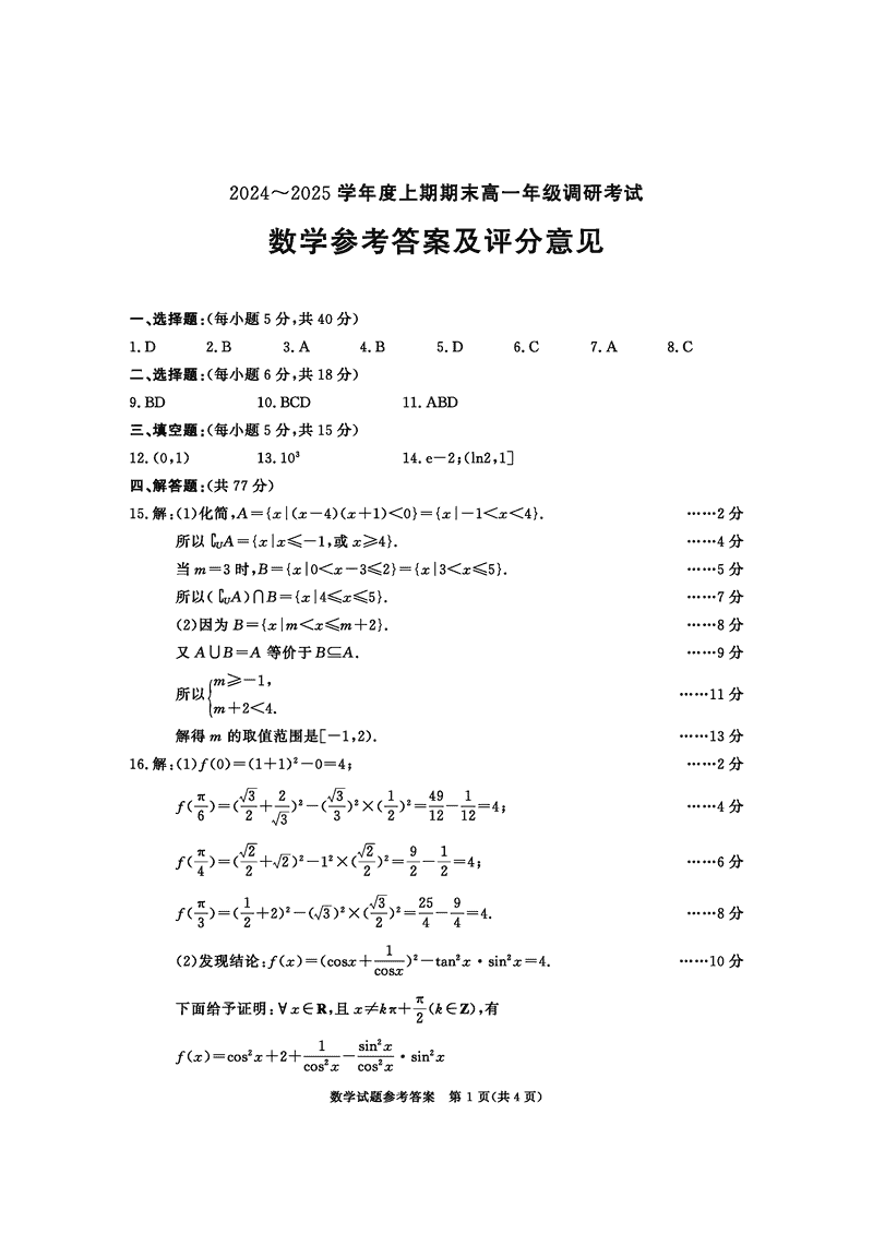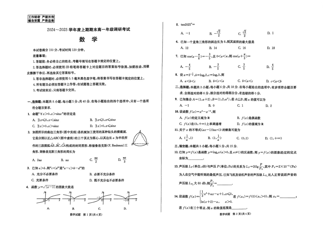 四川成都2025年高一上期期末统一调研数学试题及答案 时间:2025-01-27 四川 高中数学 四川省成都市2025年高一上期期末统一调研数学考试已于近日开考,为方便考生考后及时查看考试情况,查漏补缺、弥补不足,本文整理了试题答案解析相关信息! 数学试题及答案解析