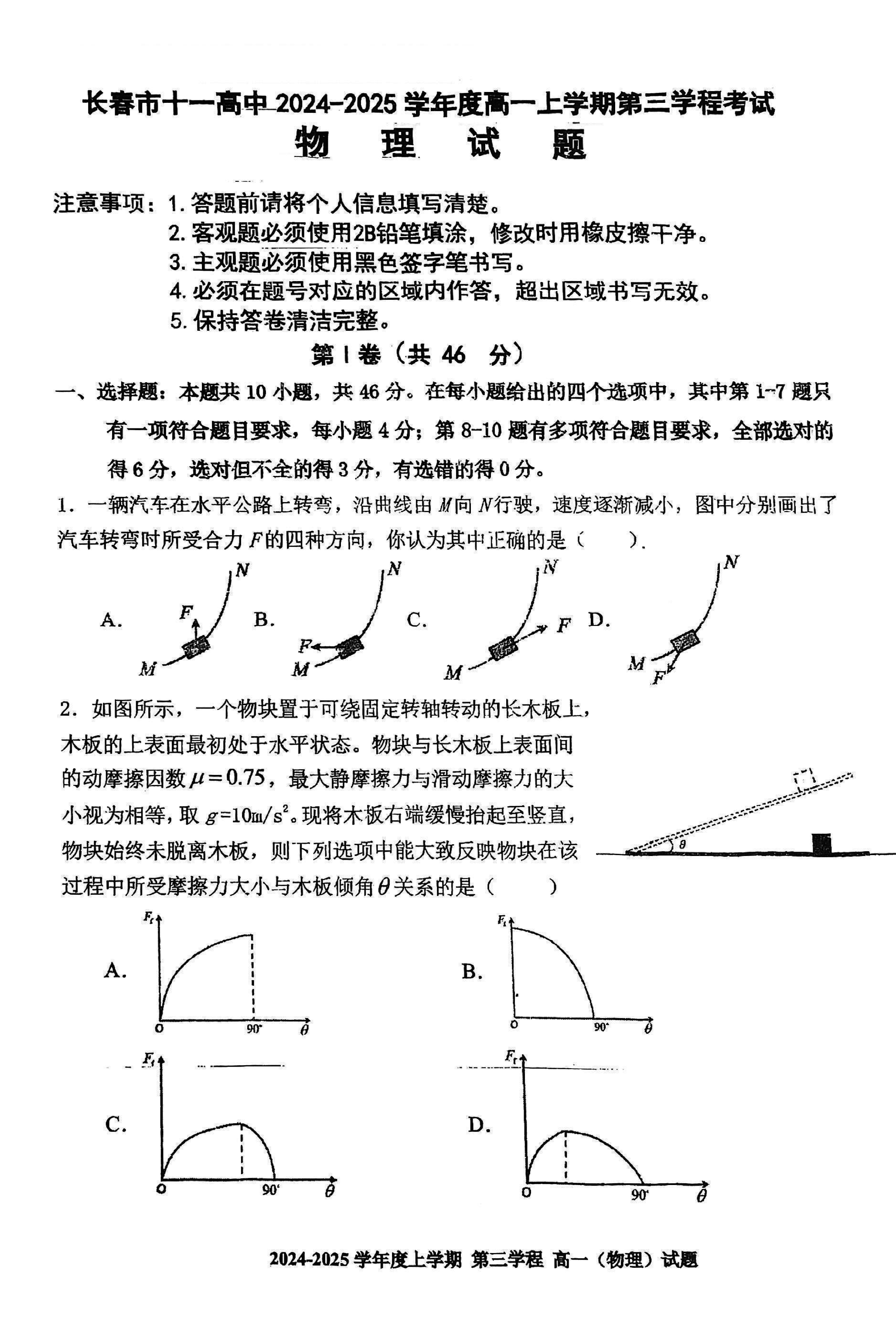 长春十一高中2024-2025学年高一上学期第三学程考物理试题及答案 时间:2025-01-27 吉林 高中物理 长春十一高中2024-2025学年高一上学期第三学程考物理考试已于近日开考,为方便考生考后及时查看考试情况,查漏补缺、弥补不足,本文整理了试题答案解析相关信息! 物理试题及答案解析