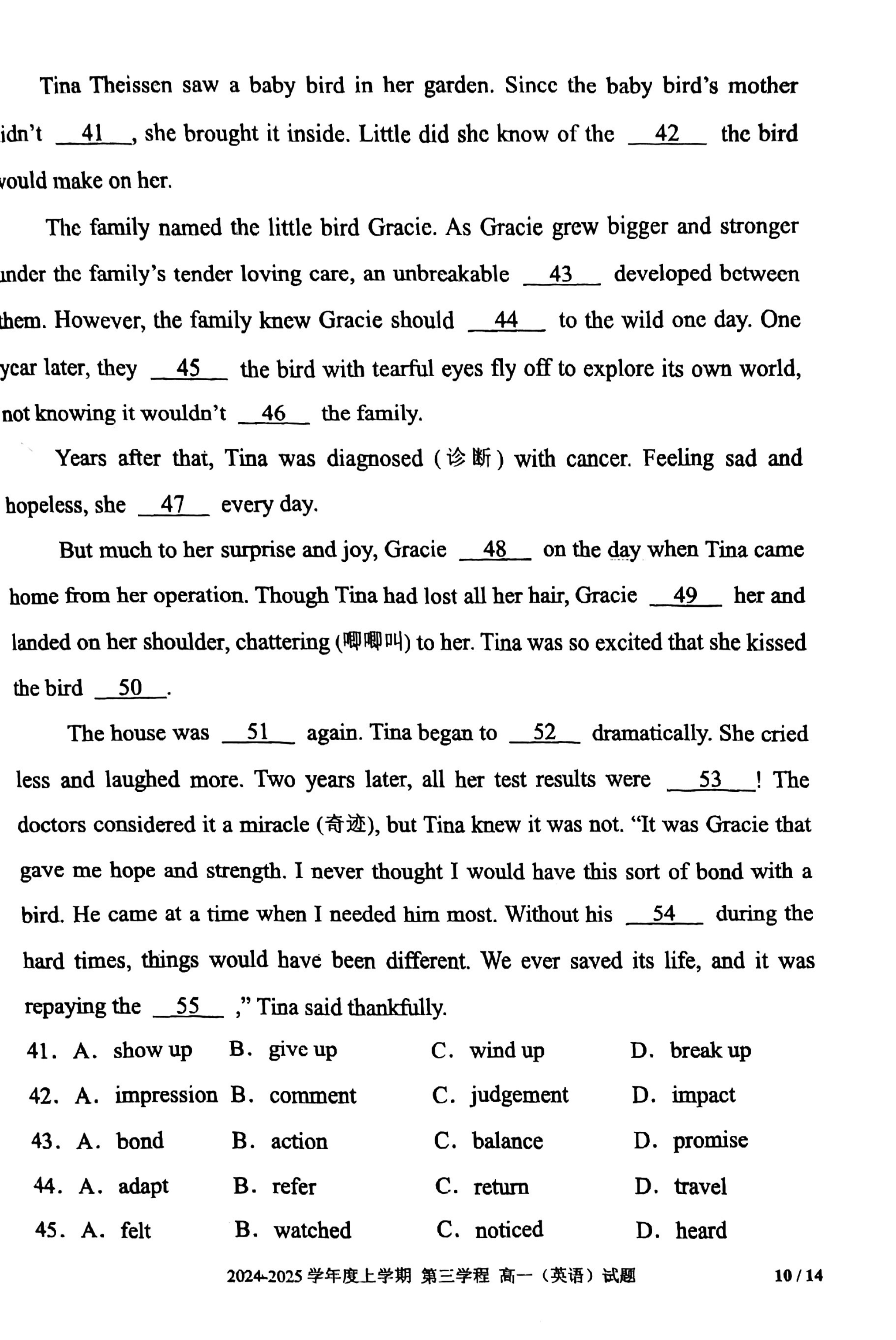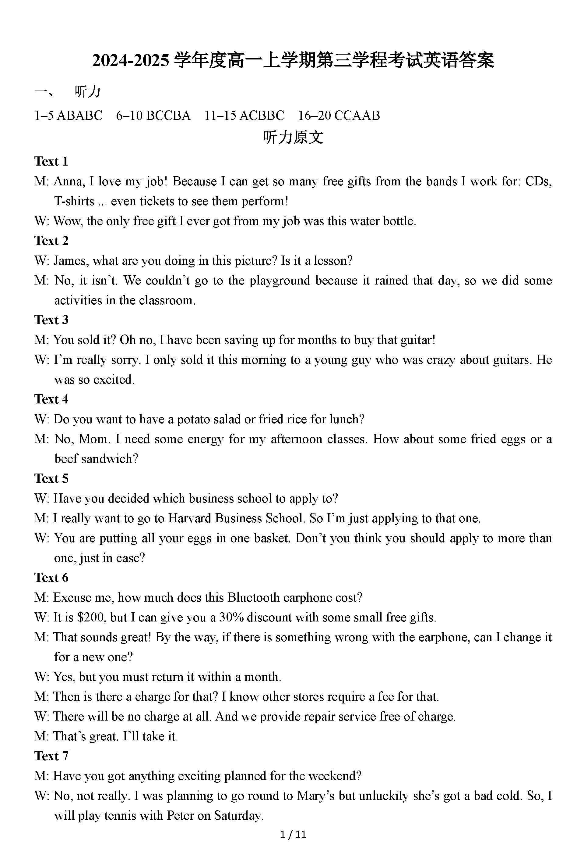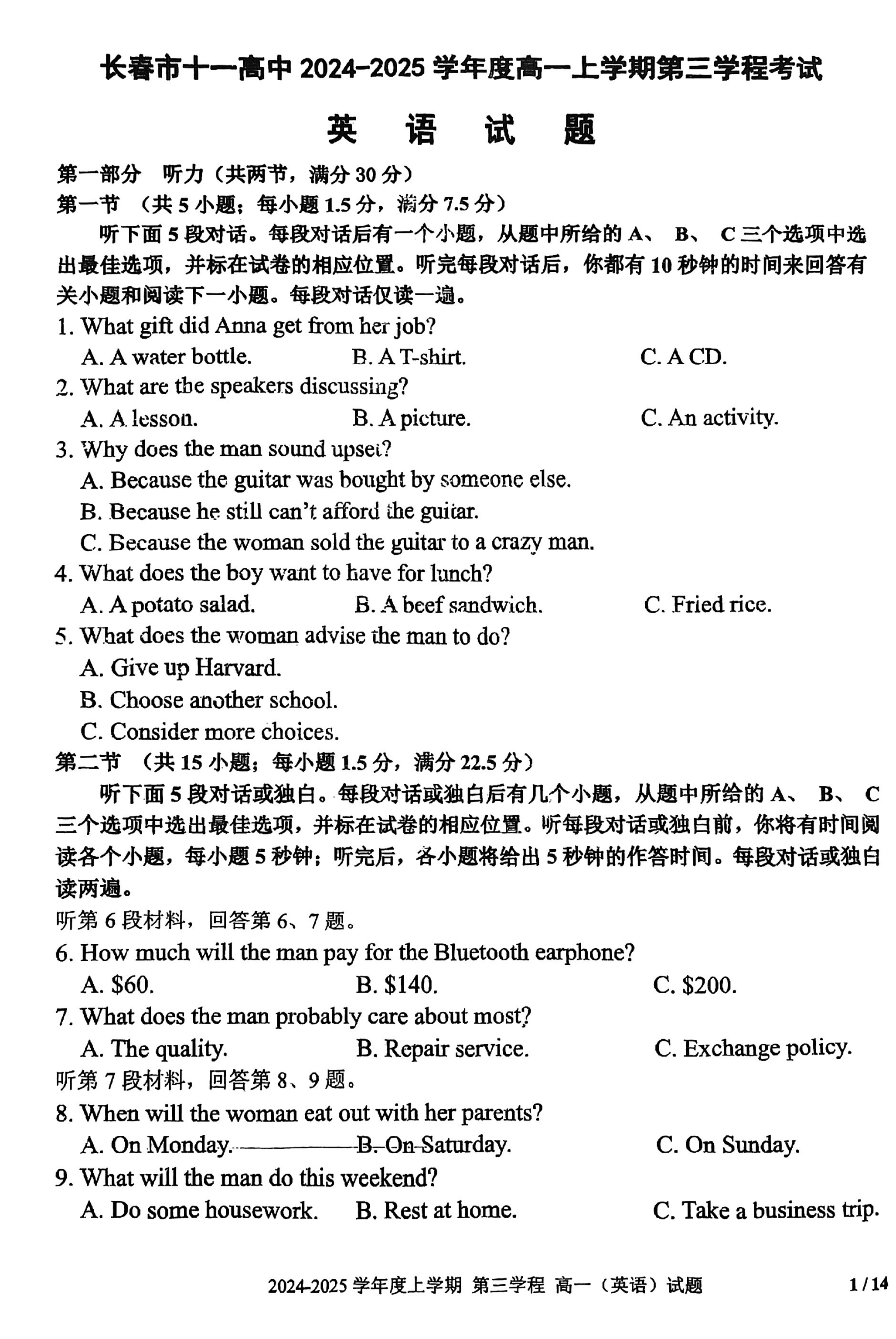 长春十一高中2024-2025学年高一上学期第三学程考英语试题及答案 时间:2025-01-27 吉林 高中英语 长春十一高中2024-2025学年高一上学期第三学程考英语考试已于近日开考,为方便考生考后及时查看考试情况,查漏补缺、弥补不足,本文整理了试题答案解析相关信息! 英语试题及答案解析