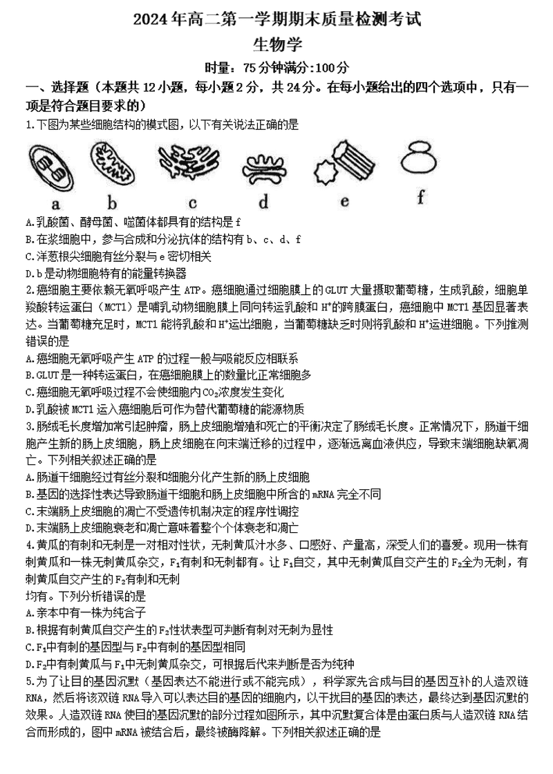 湖南炎德英才名校联合体2024-2025学年高二上学期期末联考生物试题及答案
