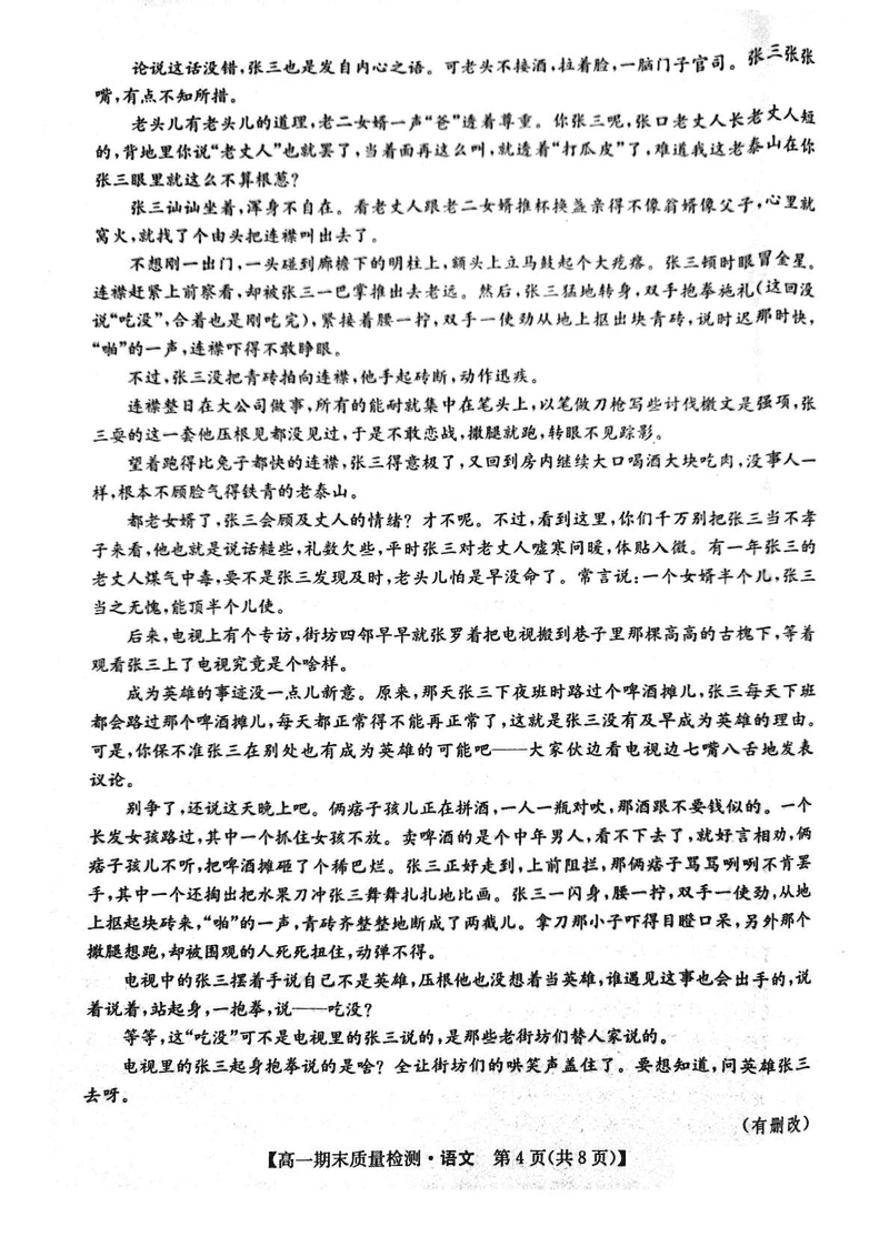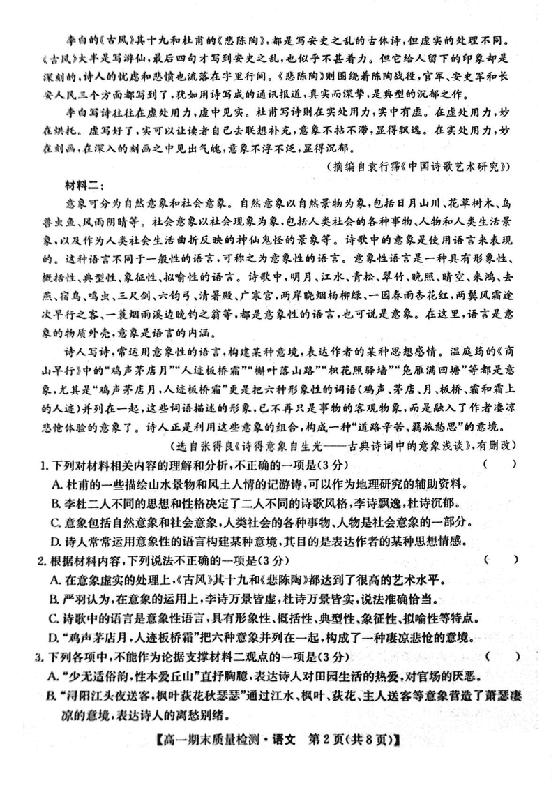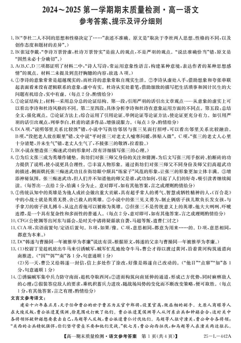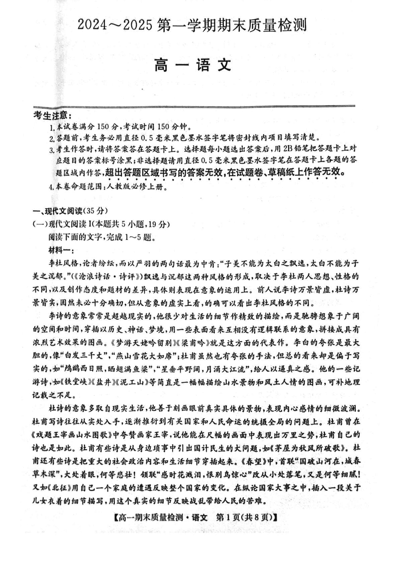 陕西榆林八校联考2024-2025学年高一上学期1月期末语文试题及答案 时间:2025-01-27 陕西 高中语文 陕西省榆林市八校联考2024-2025学年高一上学期1月期末语文考试已于近日开考,为方便考生考后及时查看考试情况,查漏补缺、弥补不足,本文整理了试题答案解析相关信息! 语文试题及答案解析