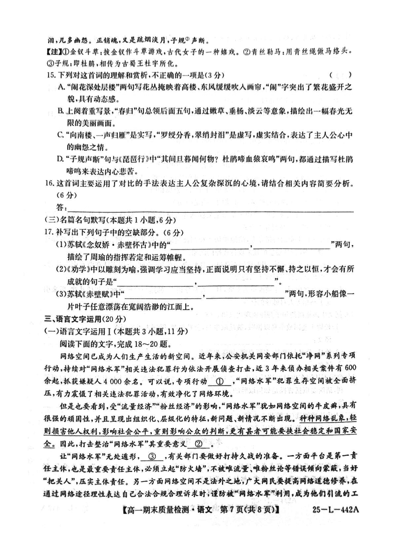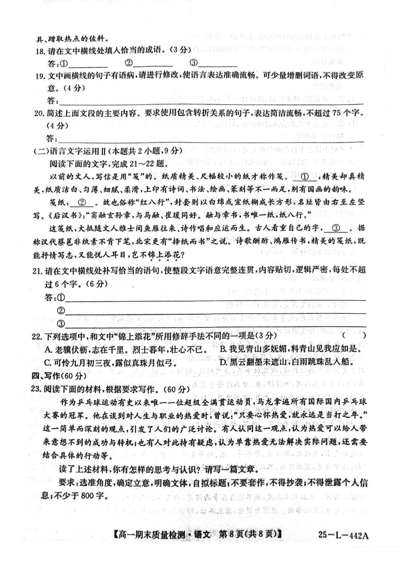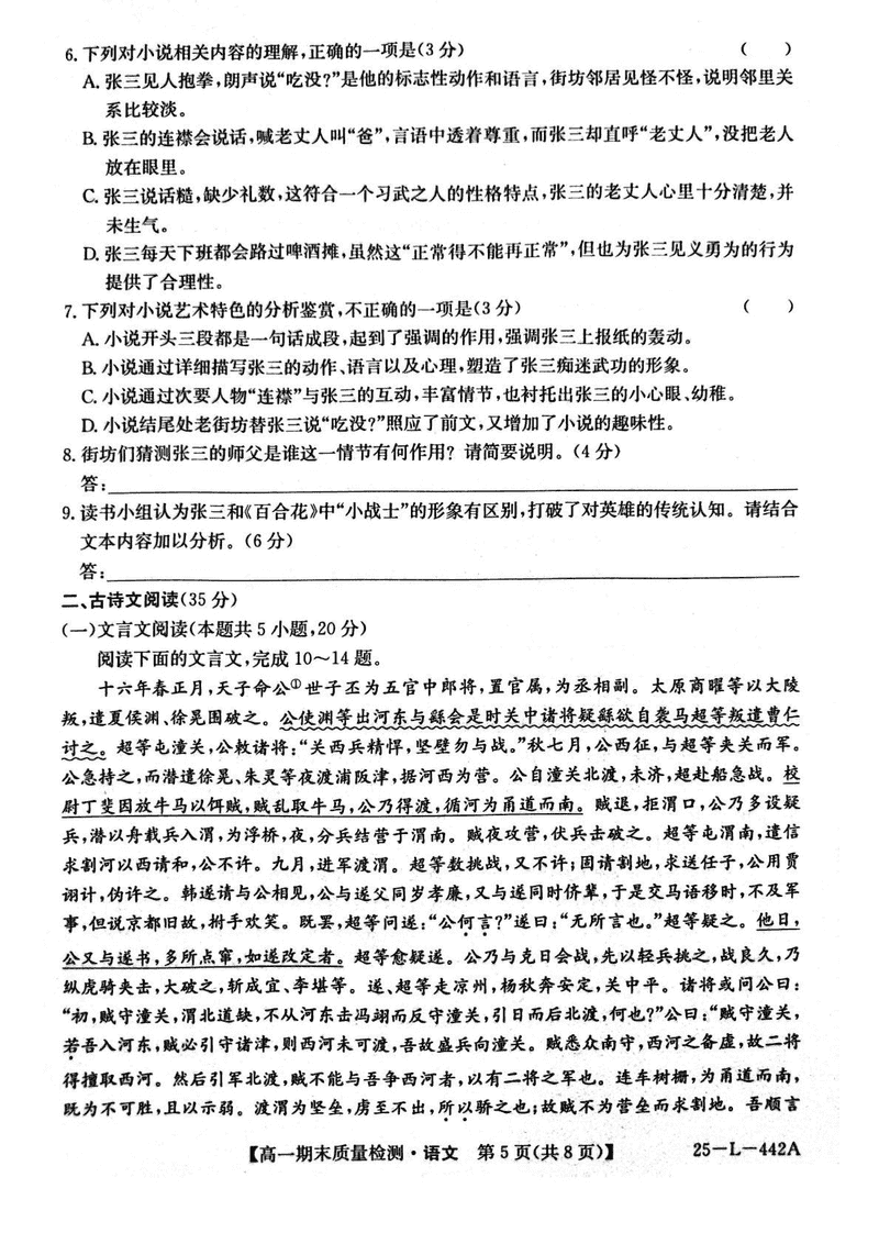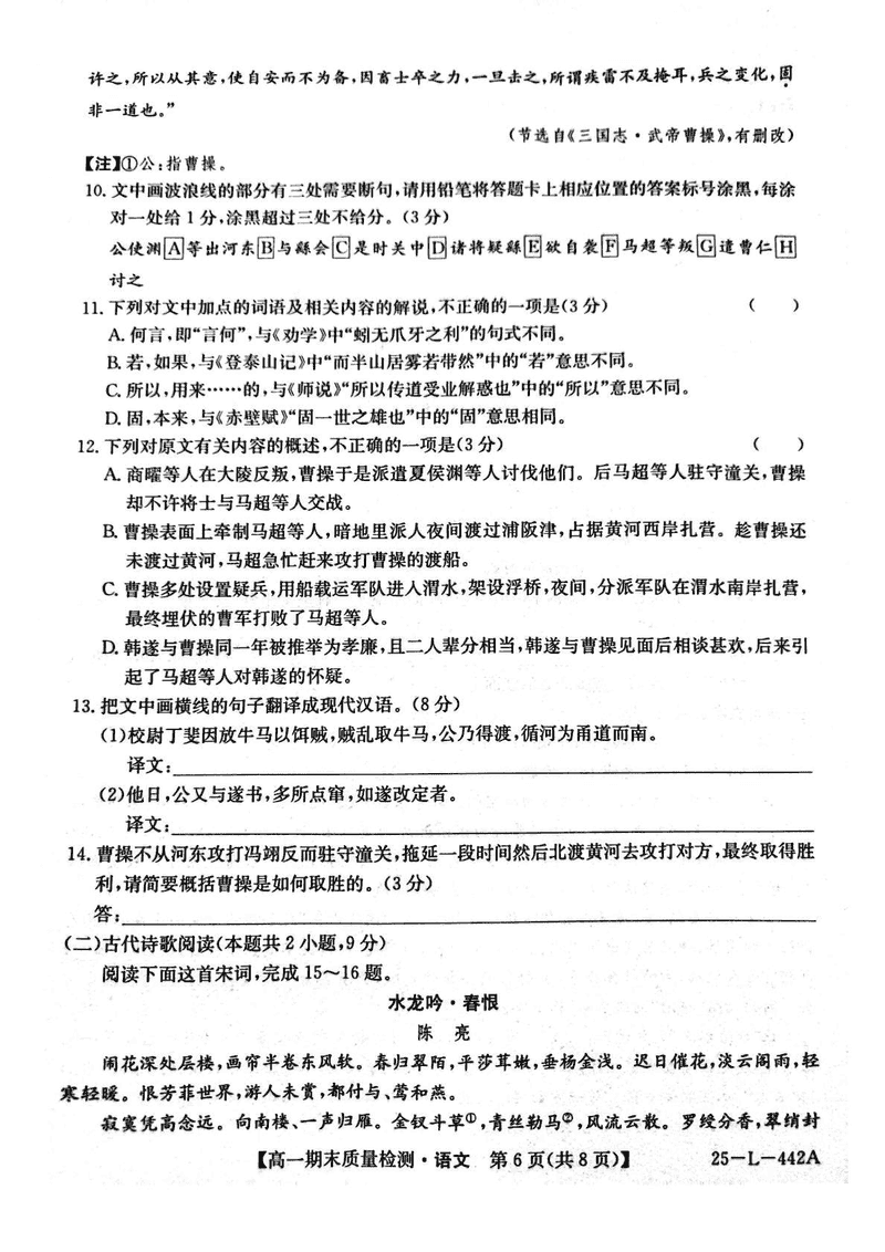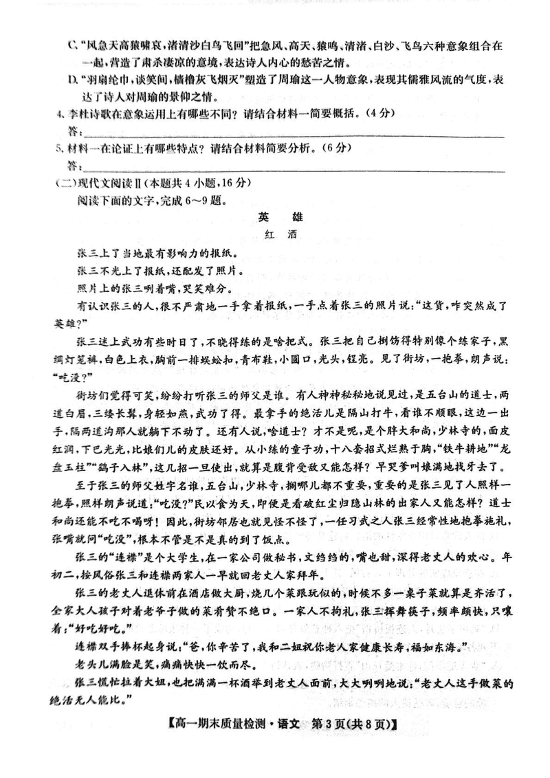 陕西榆林八校联考2024-2025学年高一上学期1月期末语文试题及答案 时间:2025-01-27 陕西 高中语文 陕西省榆林市八校联考2024-2025学年高一上学期1月期末语文考试已于近日开考,为方便考生考后及时查看考试情况,查漏补缺、弥补不足,本文整理了试题答案解析相关信息! 语文试题及答案解析