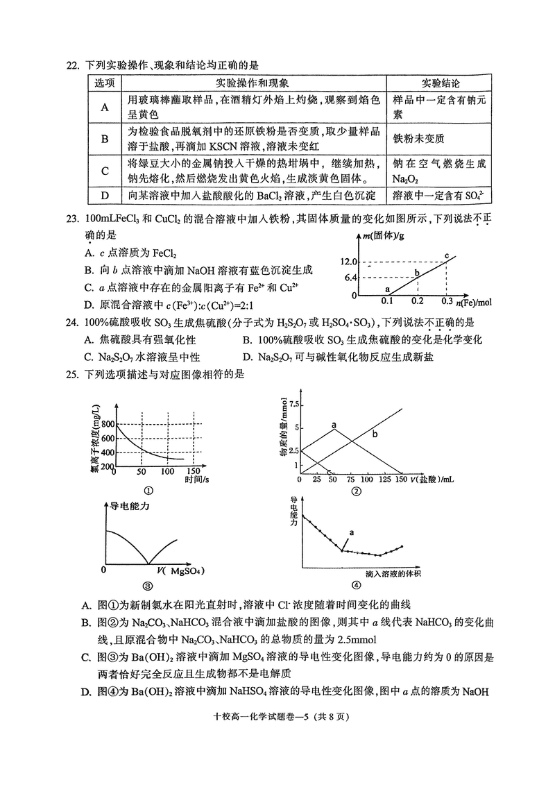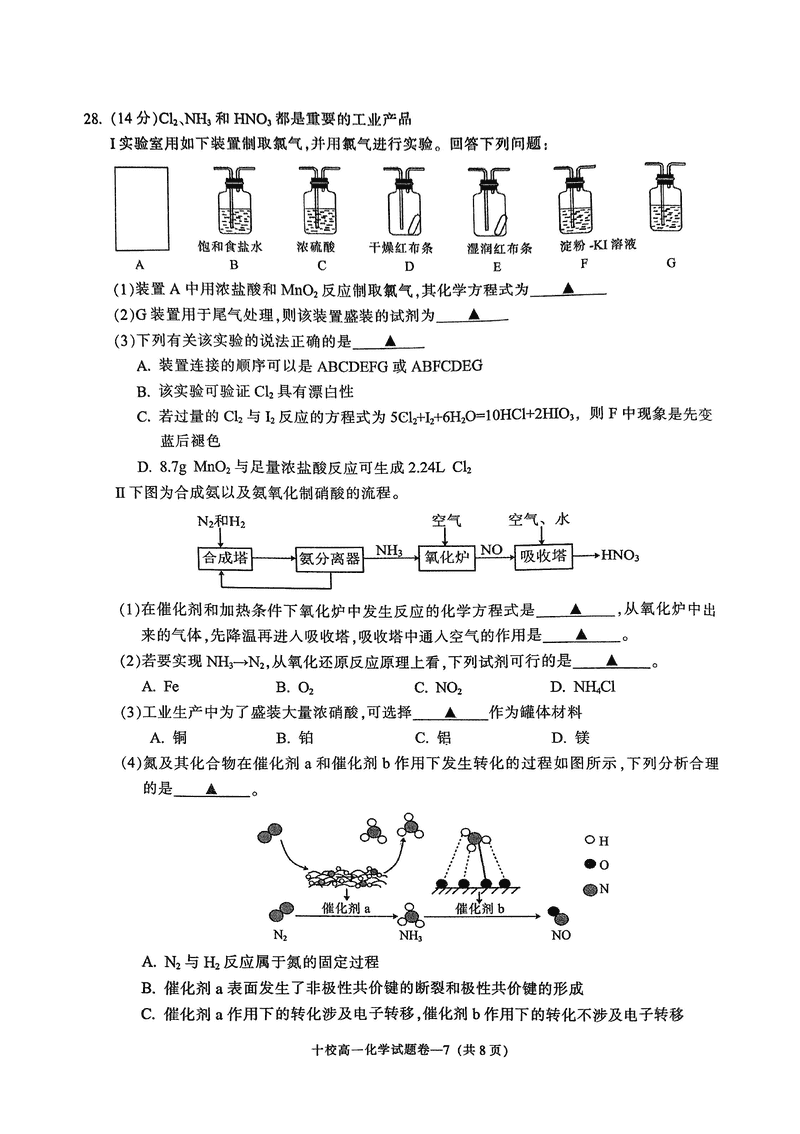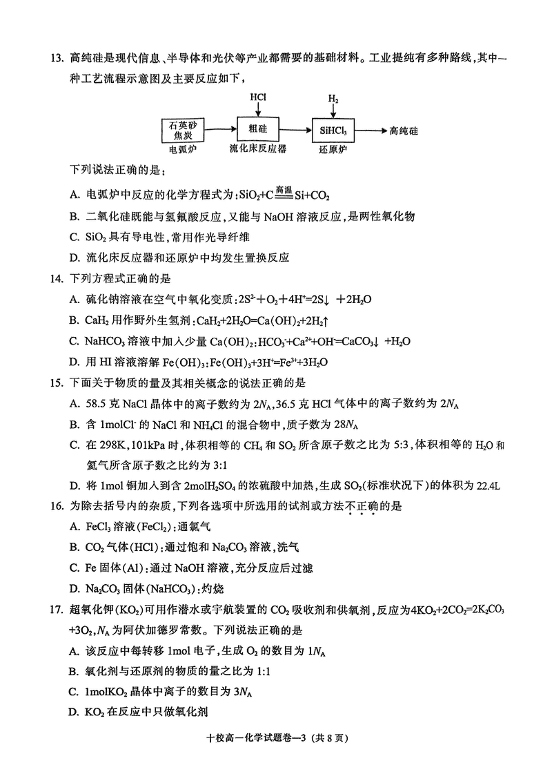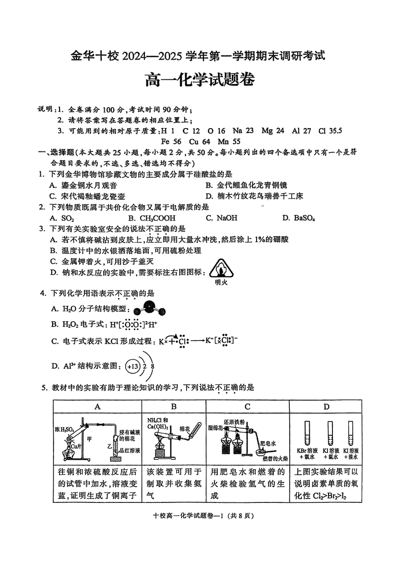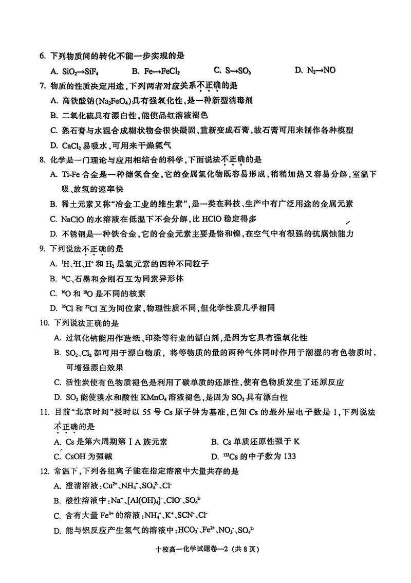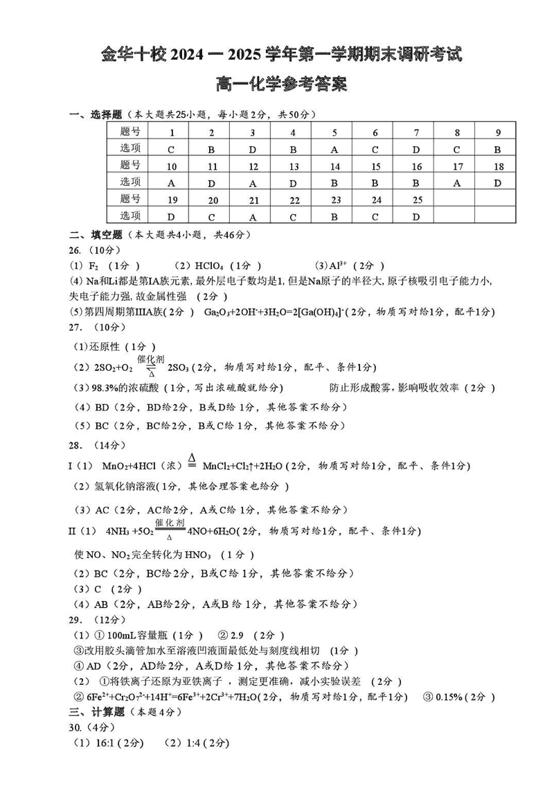 浙江金华十校2024-2025学年高一上学期期末调研化学试题及答案 时间:2025-01-27 浙江 高中化学 浙江省金华十校2024-2025学年高一上学期期末调研化学考试已于近日开考,为方便考生考后及时查看考试情况,查漏补缺、弥补不足,本文整理了试题答案解析相关信息! 化学试题及答案解析