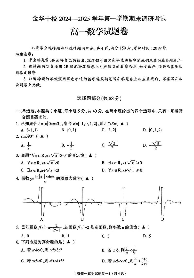 浙江金华十校2024-2025学年高一上学期期末调研数学试题及答案 时间:2025-01-27 浙江 高中数学 浙江省金华十校2024-2025学年高一上学期期末调研数学考试已于近日开考,为方便考生考后及时查看考试情况,查漏补缺、弥补不足,本文整理了试题答案解析相关信息! 数学试题及答案解析