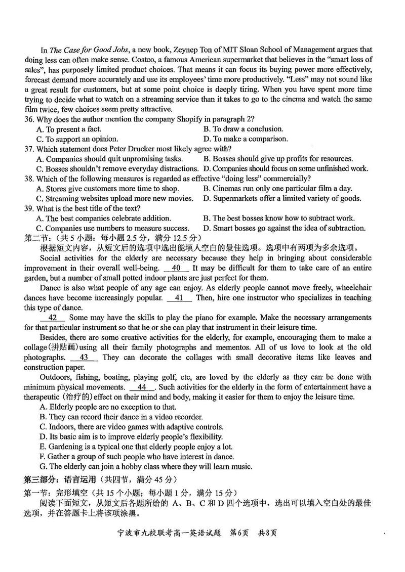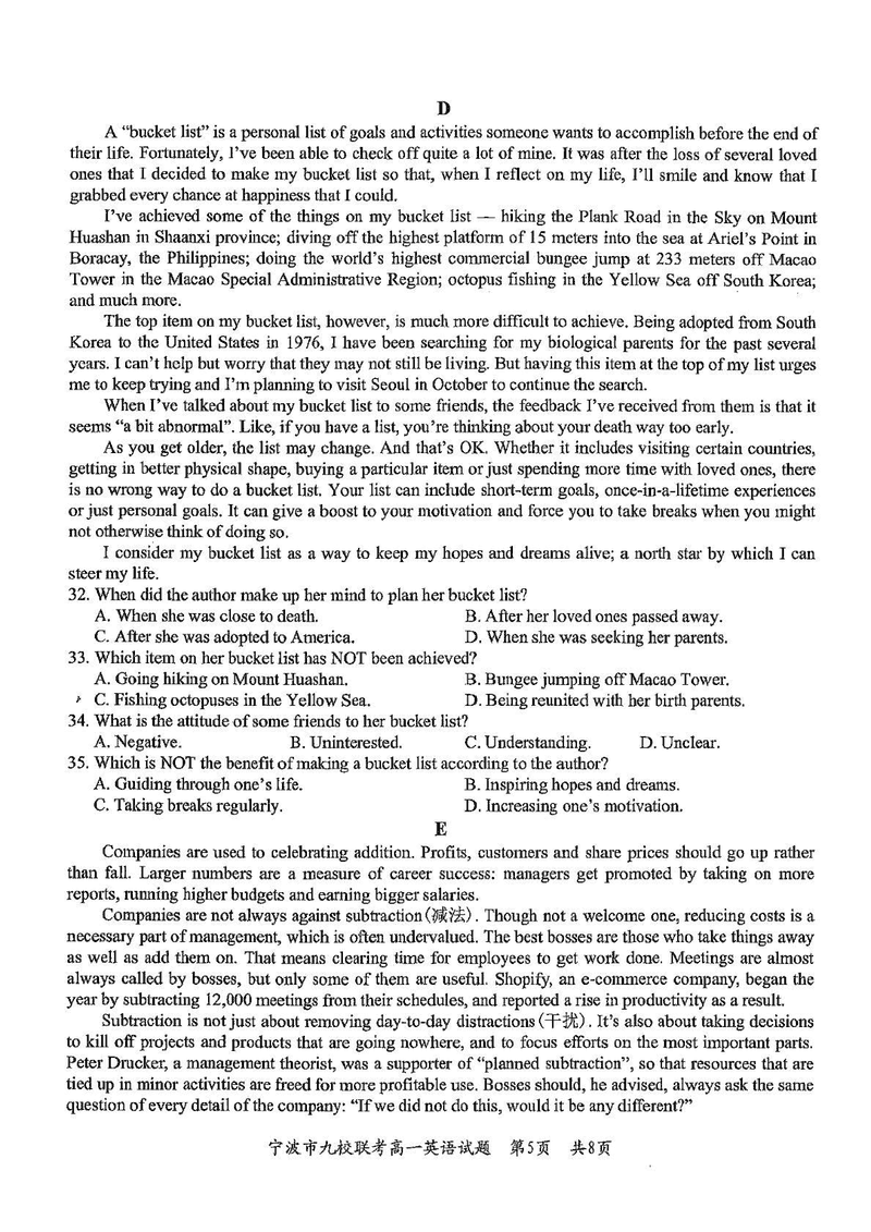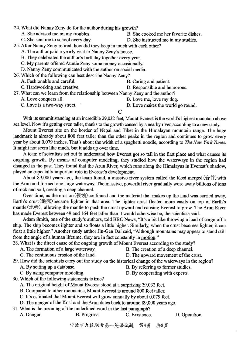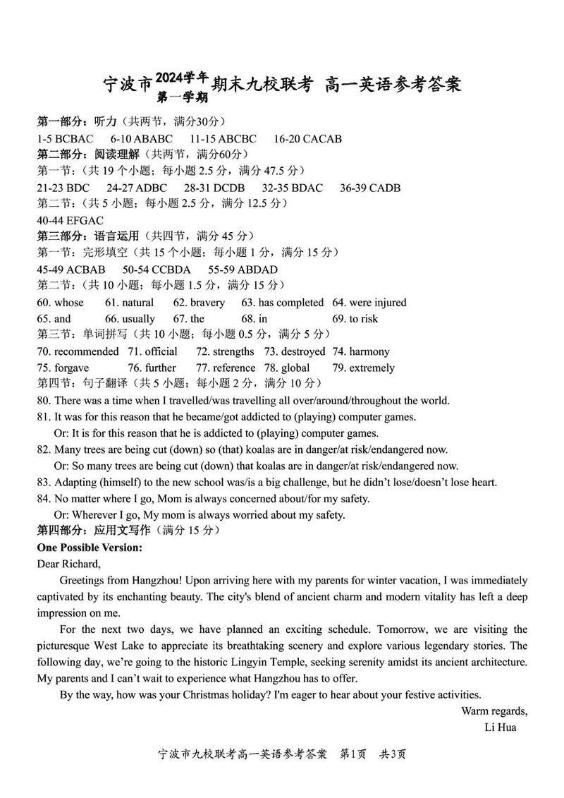 宁波九校2024-2025学年高一上学期期末英语试题及答案 时间:2025-01-27 浙江 高中英语 浙江省宁波市九校2024-2025学年高一上学期期末英语考试已于近日开考,为方便考生考后及时查看考试情况,查漏补缺、弥补不足,本文整理了试题答案解析相关信息! 英语试题及答案解析