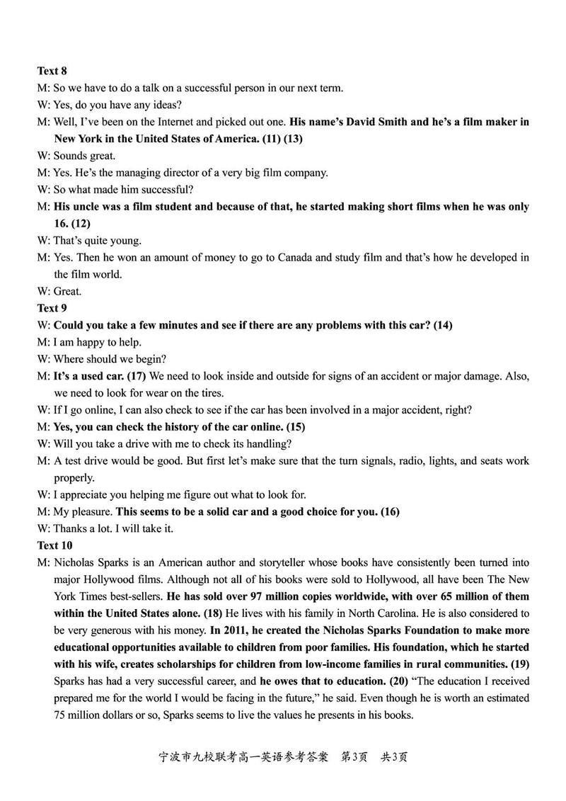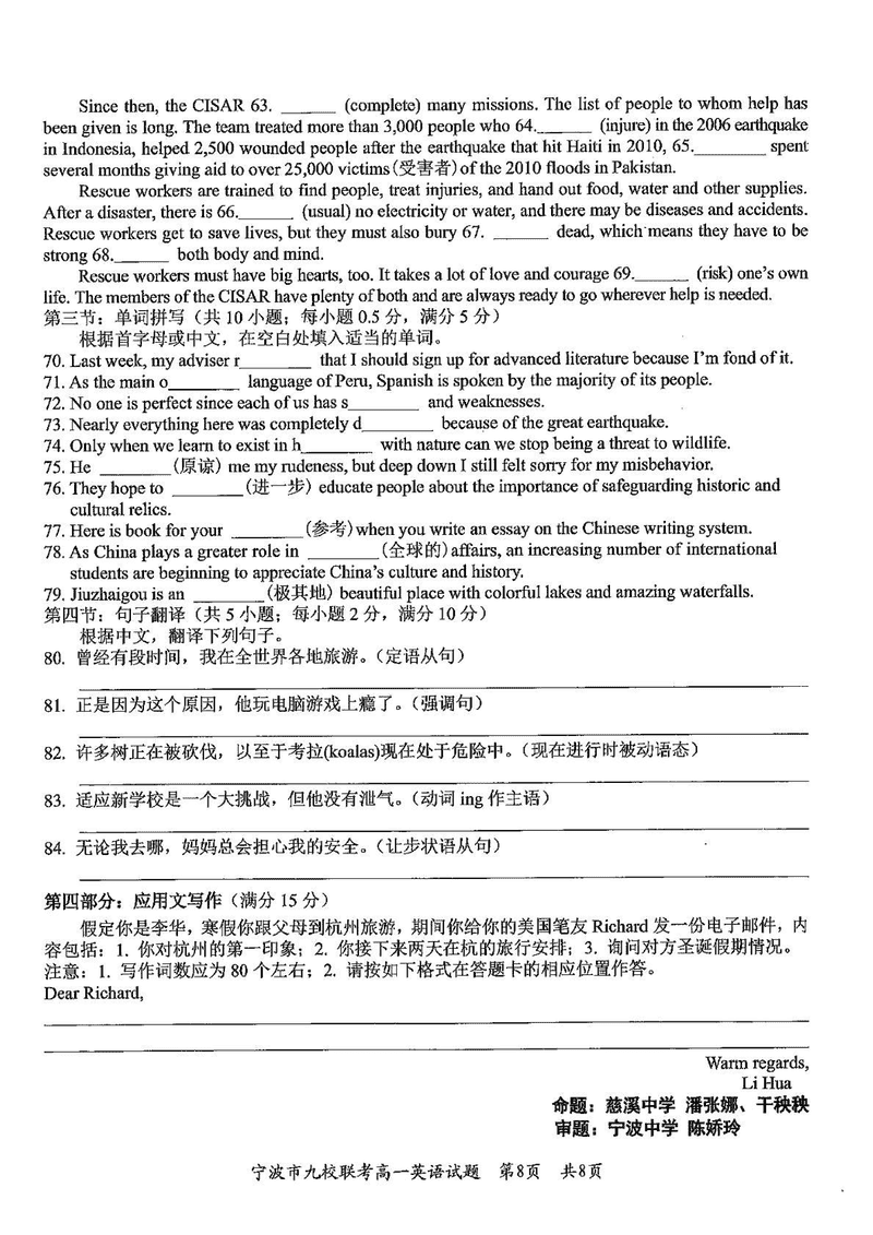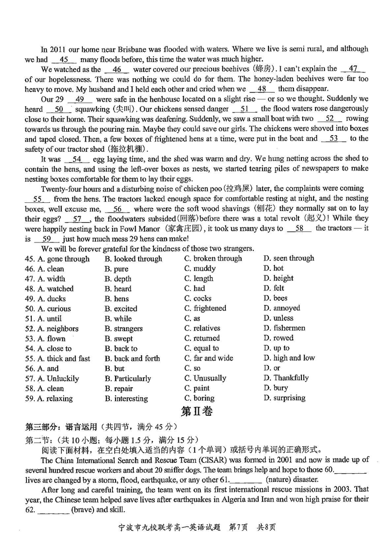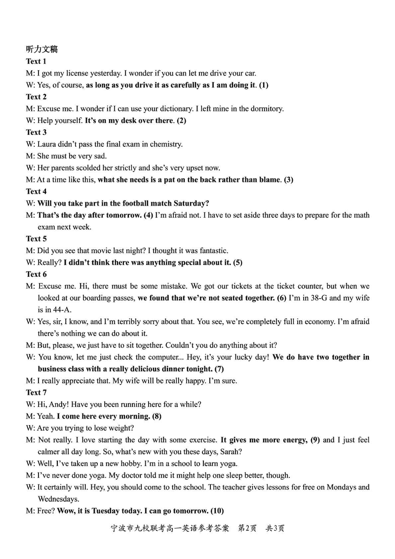 宁波九校2024-2025学年高一上学期期末英语试题及答案 时间:2025-01-27 浙江 高中英语 浙江省宁波市九校2024-2025学年高一上学期期末英语考试已于近日开考,为方便考生考后及时查看考试情况,查漏补缺、弥补不足,本文整理了试题答案解析相关信息! 英语试题及答案解析