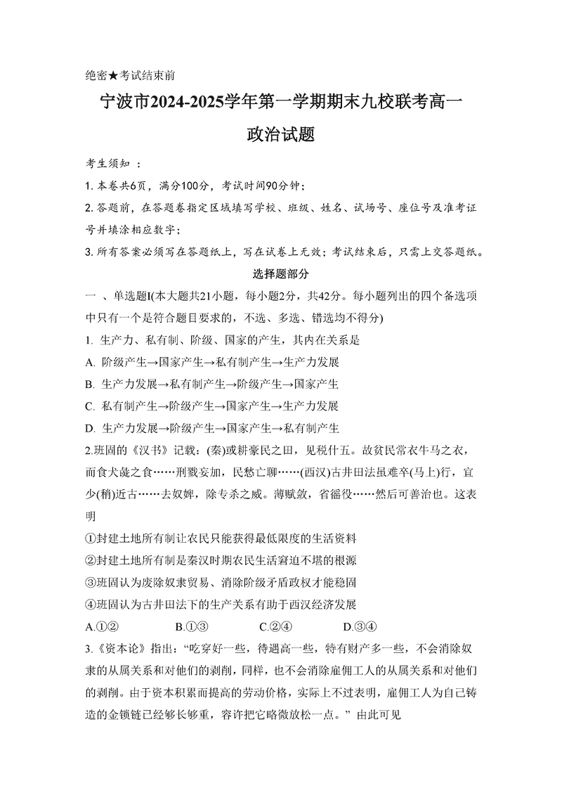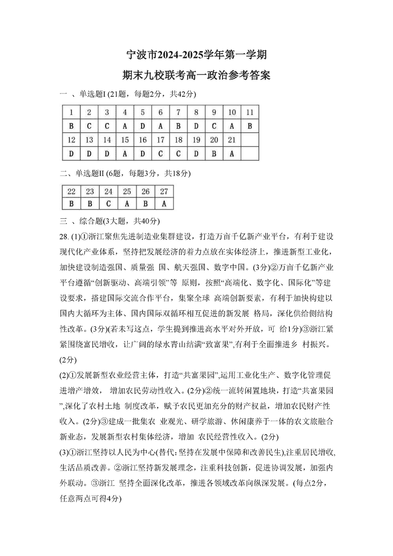 宁波九校2024-2025学年高一上学期期末政治试题及答案 时间:2025-01-27 浙江 高中政治 浙江省宁波市九校2024-2025学年高一上学期期末政治考试已于近日开考,为方便考生考后及时查看考试情况,查漏补缺、弥补不足,本文整理了试题答案解析相关信息! 政治试题及答案解析