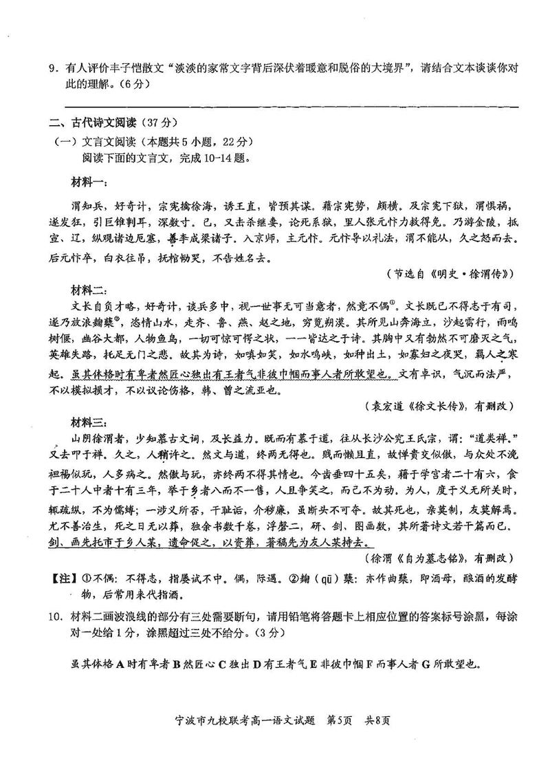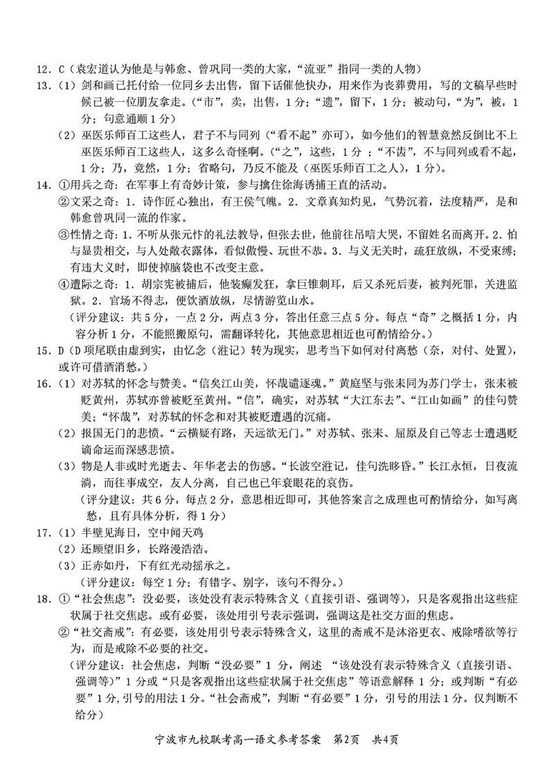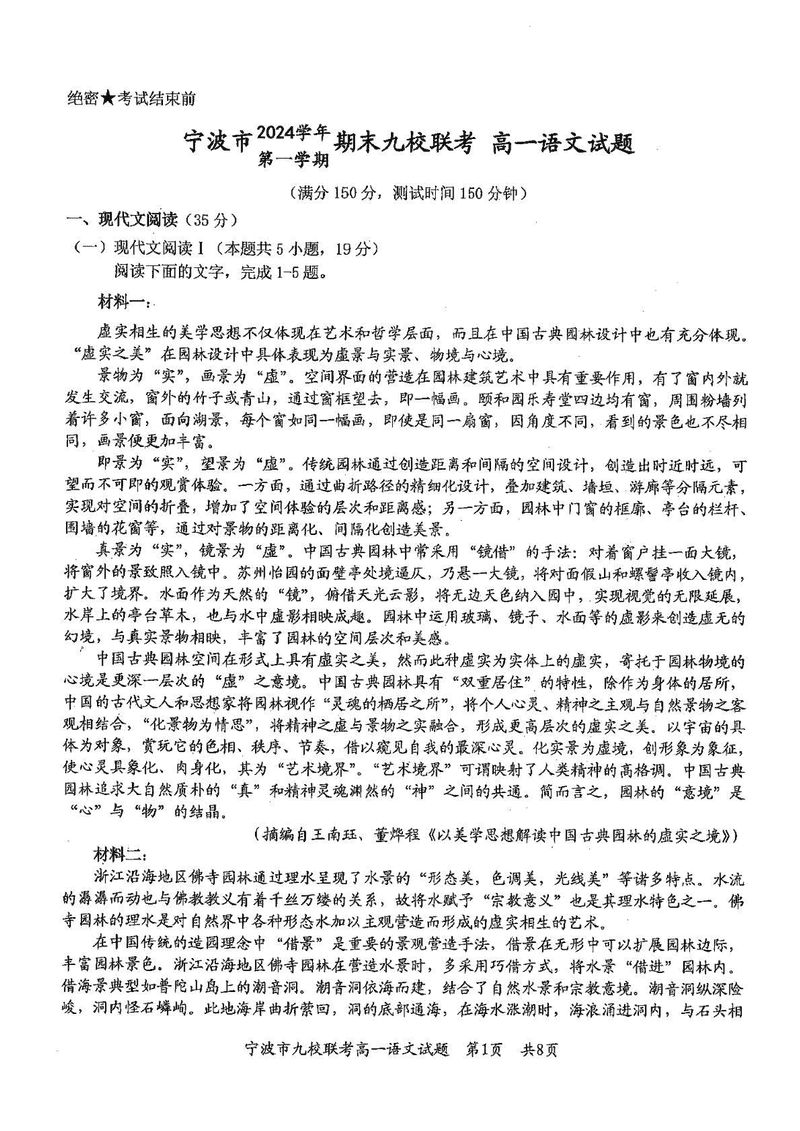 宁波九校2024-2025学年高一上学期期末语文试题及答案 时间:2025-01-27 浙江 高中语文 浙江省宁波市九校2024-2025学年高一上学期期末语文考试已于近日开考,为方便考生考后及时查看考试情况,查漏补缺、弥补不足,本文整理了试题答案解析相关信息! 语文试题及答案解析
