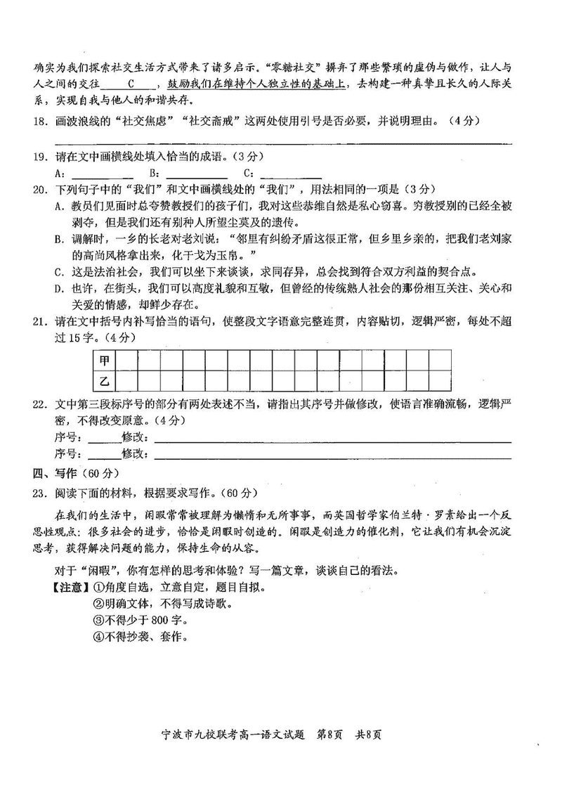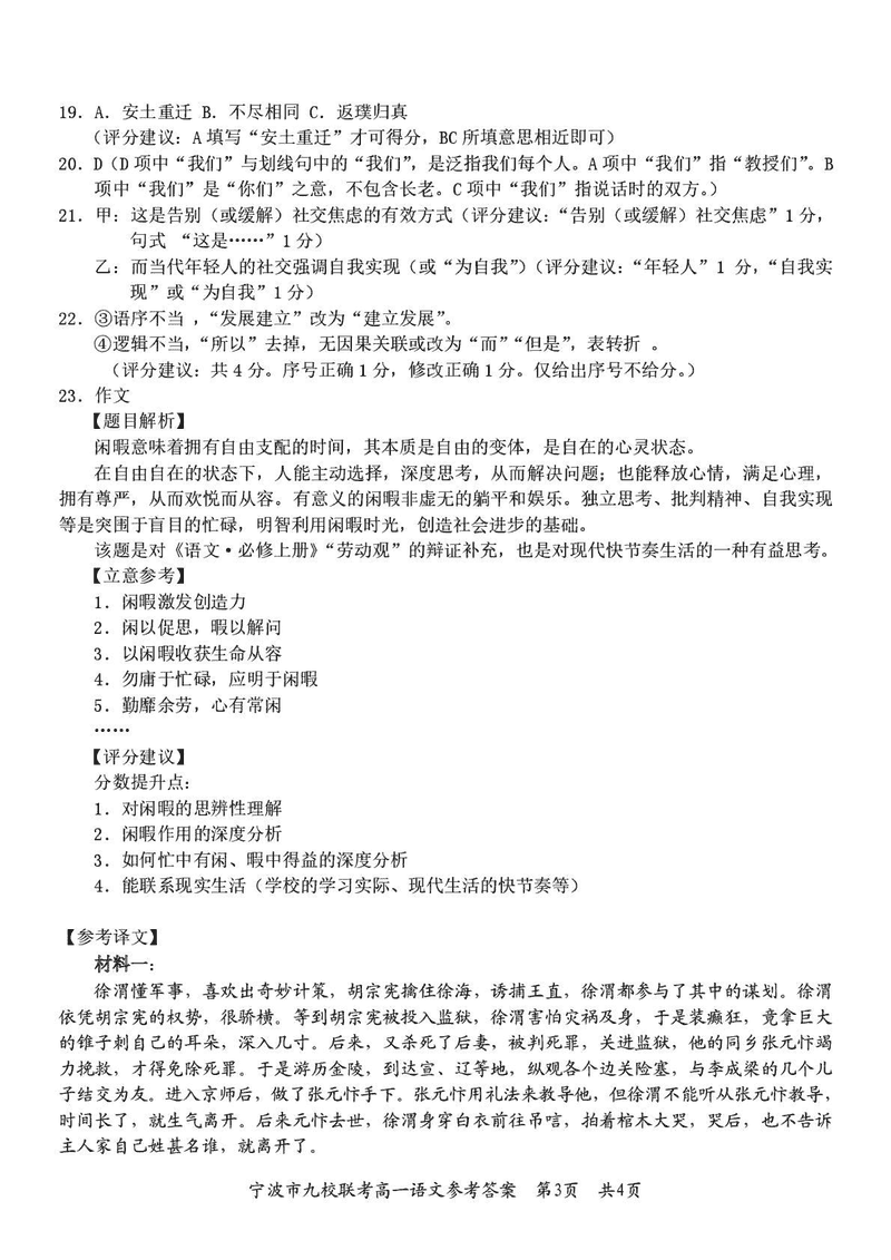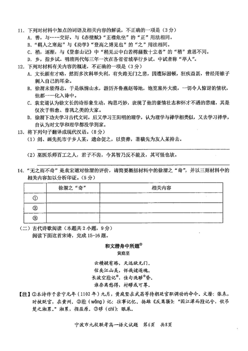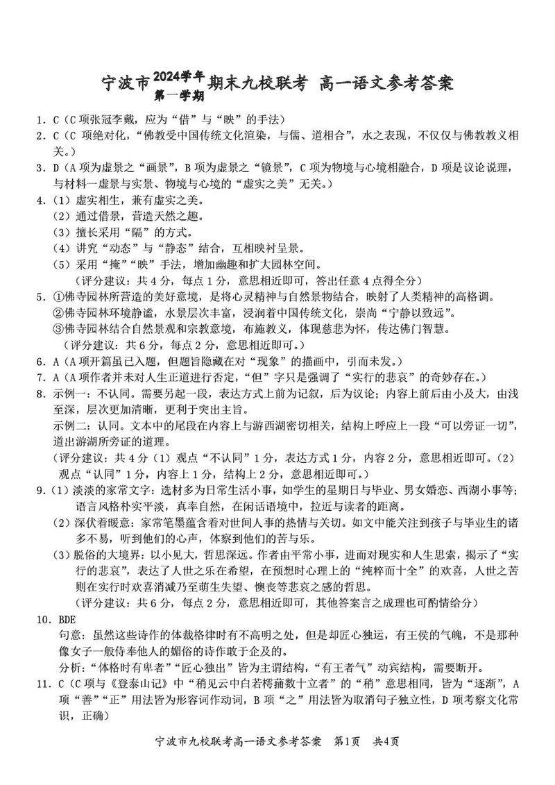 宁波九校2024-2025学年高一上学期期末语文试题及答案 时间:2025-01-27 浙江 高中语文 浙江省宁波市九校2024-2025学年高一上学期期末语文考试已于近日开考,为方便考生考后及时查看考试情况,查漏补缺、弥补不足,本文整理了试题答案解析相关信息! 语文试题及答案解析